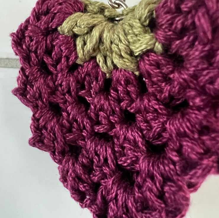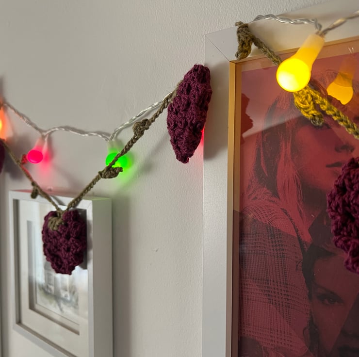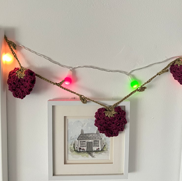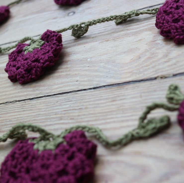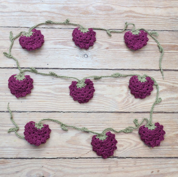 Handmade in Dorset, with nine crochet blackberries joined with crochet stem & leaves. Each Blackberry measures 6cm x 7cm x 1cm, the full length of the bunting is 185cm long.