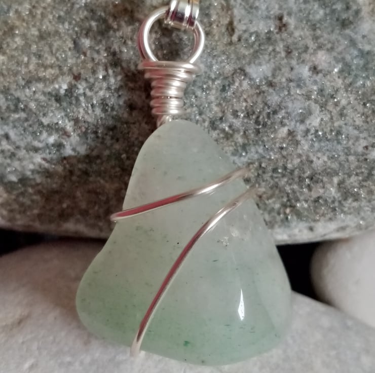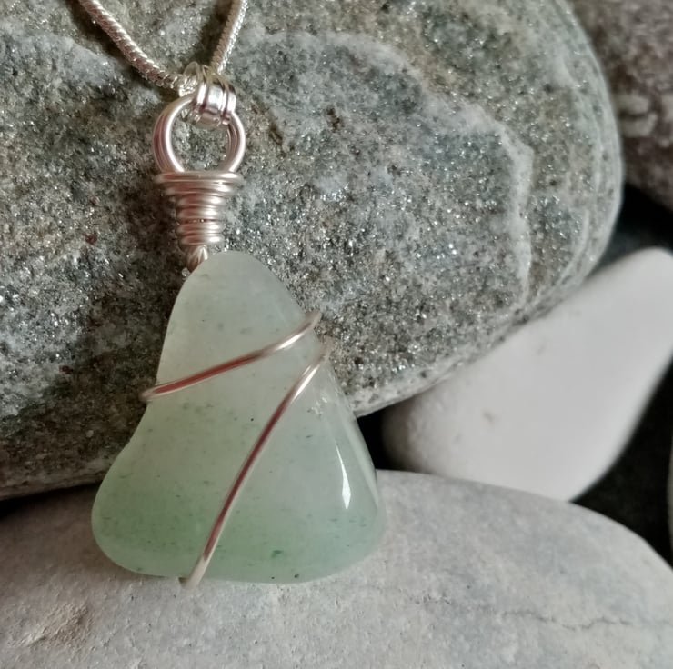Wire-wrapped natural Aventurine tumble stone with silver plated snake chain.