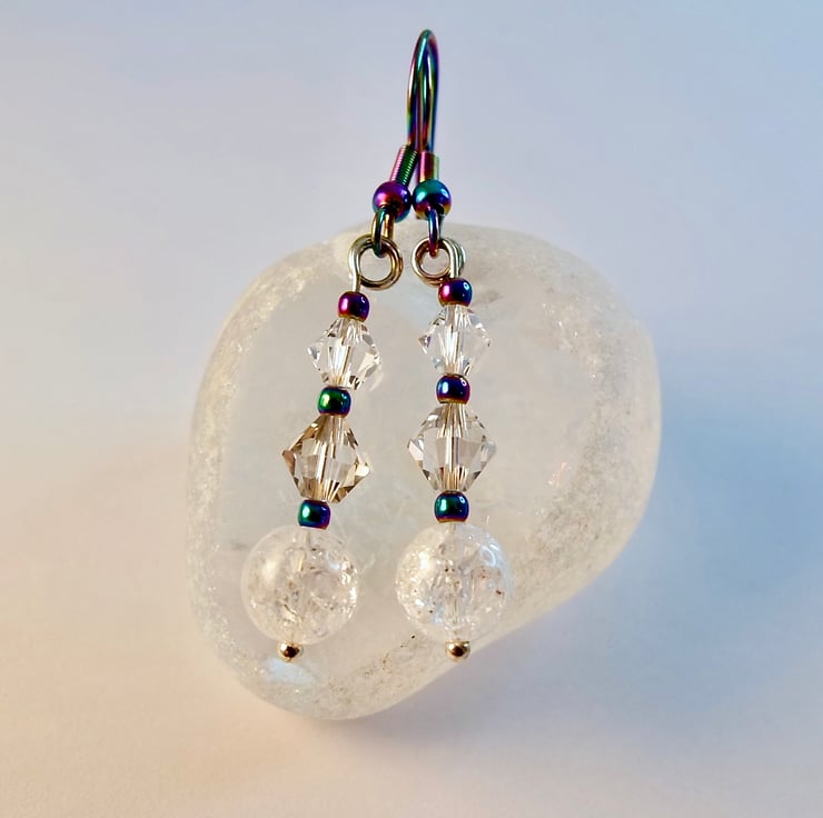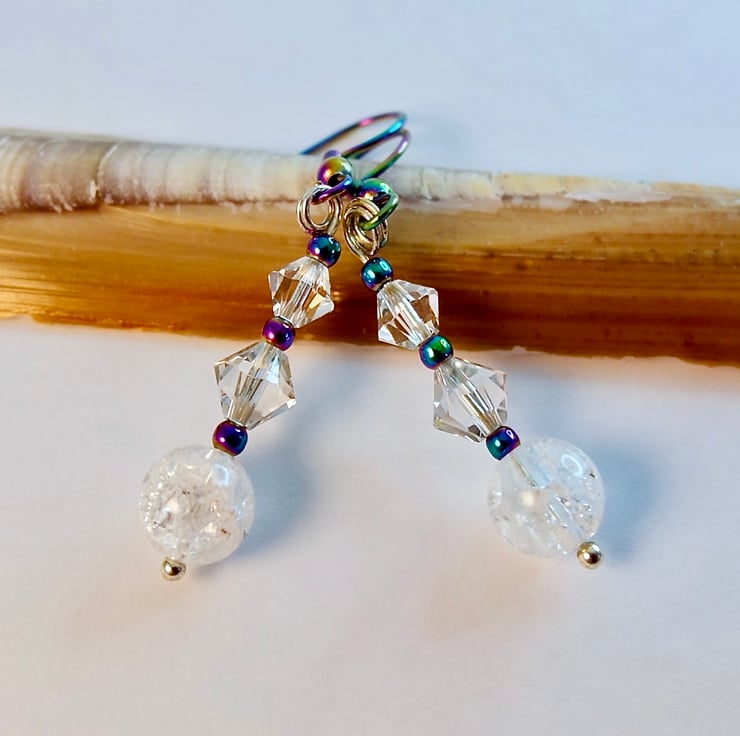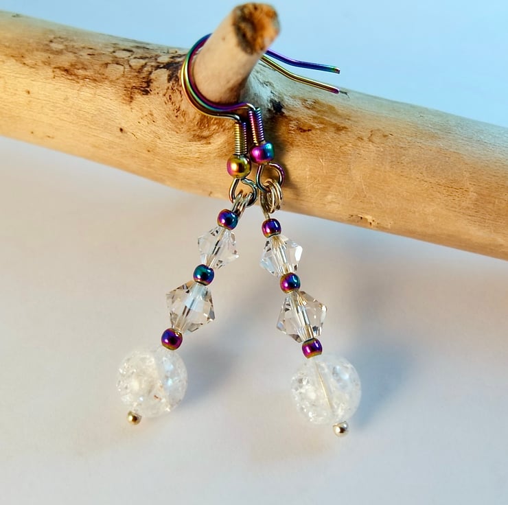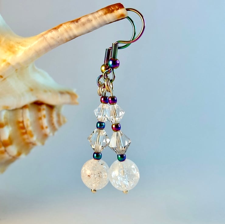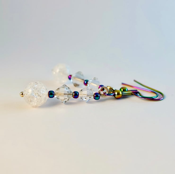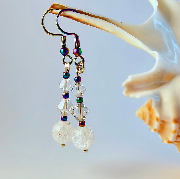 These super sparkly earrings feature an 8mm crackle Quartz bead, a 6mm quality Austrian crystal 'silver shade' bicone and a 5mm clear crystal bicone, highlighted with tiny 2mm Rainbow Hematite spacers.