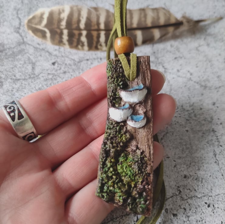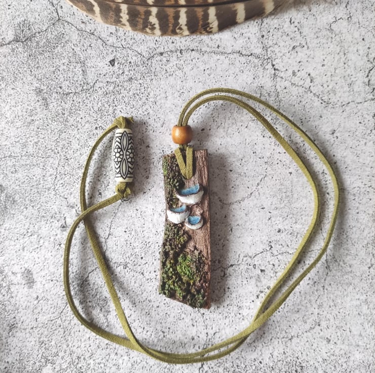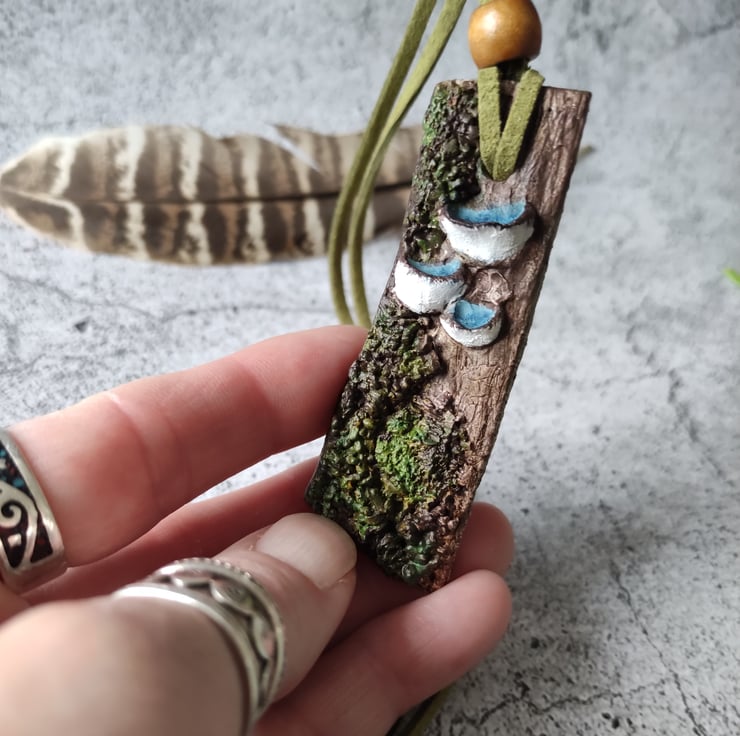 Embrace your inner Green Witch with my unique clay forest mushroom pendant necklace. Entirely handmade from clay, this necklace features little blue tipped bracket fungi, surrounded by cushions of moss on weathered wood. Perfect for fungi lovers or fans of the naturecore aesthetic. Add a touch of woodland magic to your ensemble!