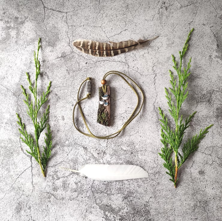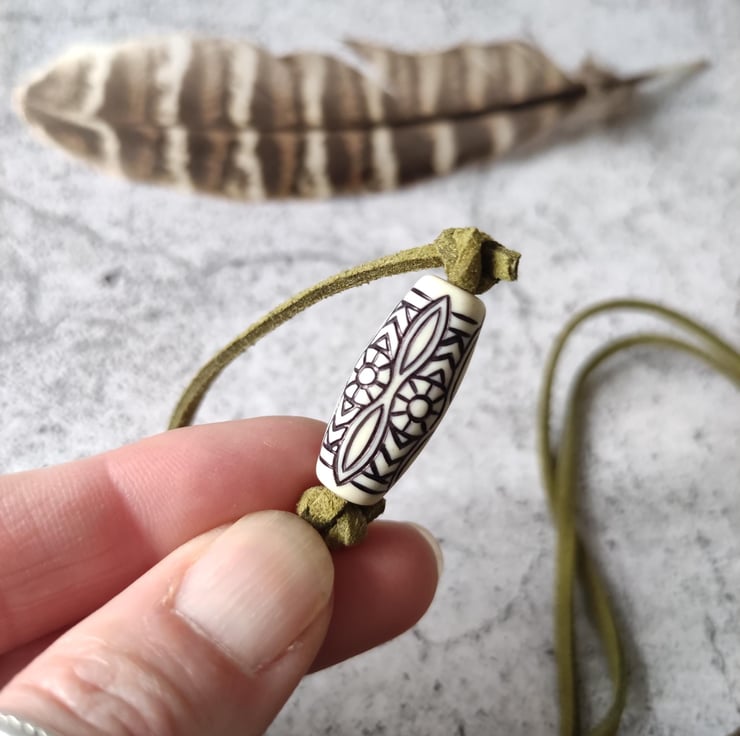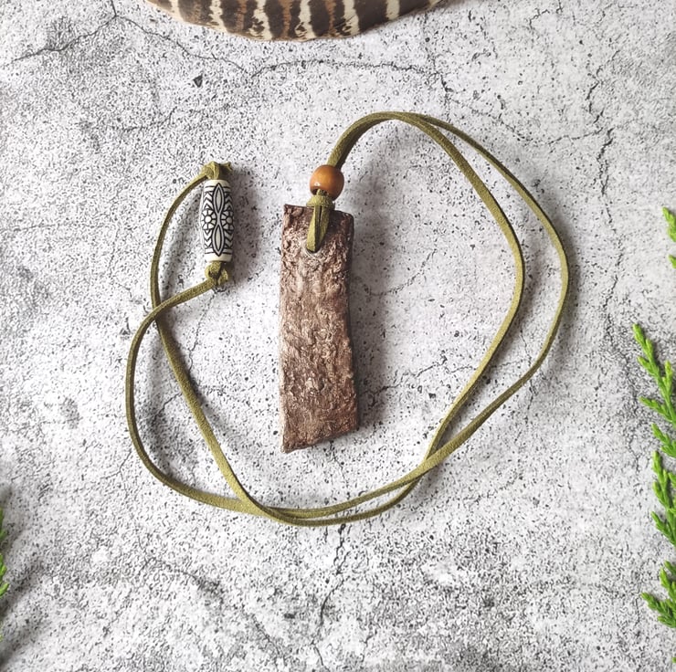 My pendants are strung with a soft olive green vegan suede cord, a single wood bead and a floral patterned ceramic bead. Perfect if you have problems wearing metal jewellery!