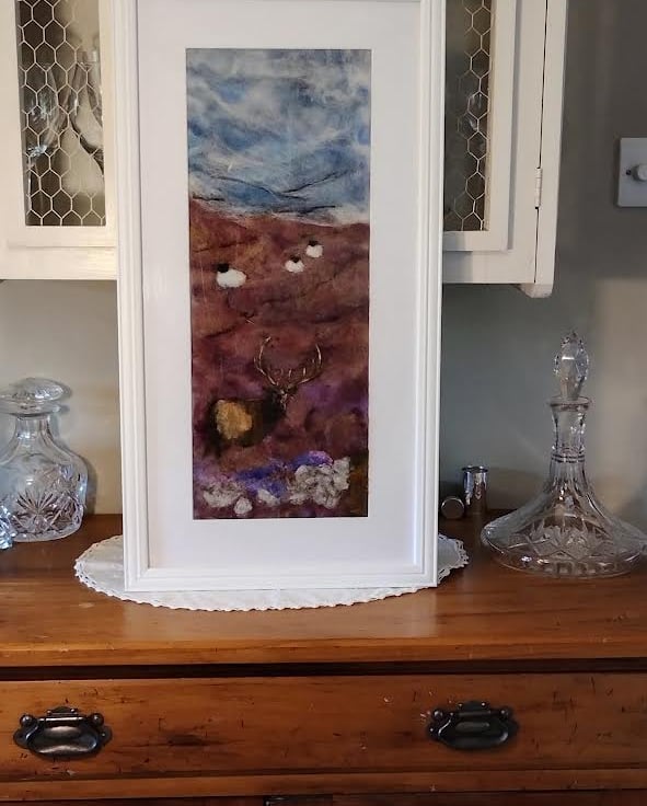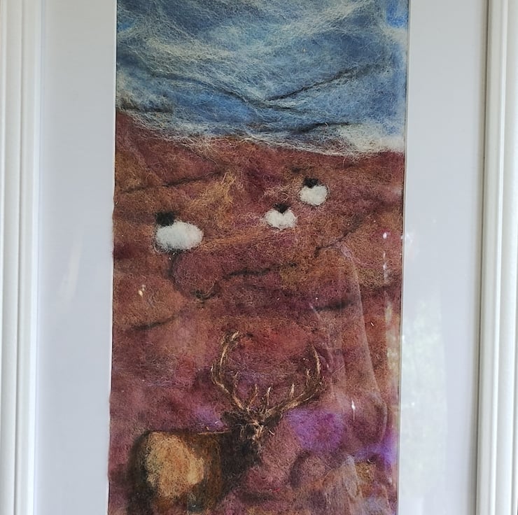 Living in Scotland and having seen many stags on the hills as a child and having always admired Edwin Landseer's Monarch of the Glen masterpiece, I thought I would create my own version. Using Galloway sheep wool and selecting some of the many glorious colours of dyed wool I have in stock I created this felted wool landscape. Comes with a wood frame with Perspex glass which has been strung at the back for ease of hanging. A beautiful Christmas gift. Ready to be posted now.