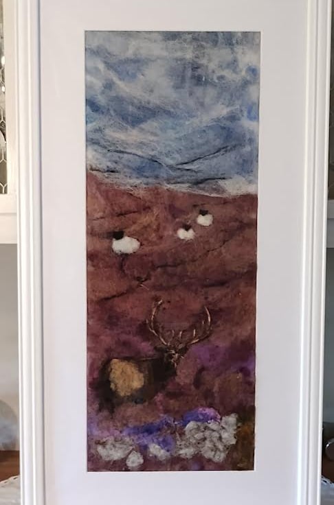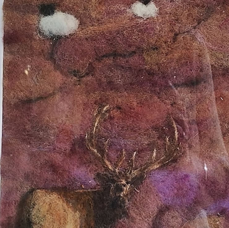 Coming from a farming family up in the Highlands of Scotland I spent many a day with our Ghillie up on the hill and saw many beautiful stags with their glorious horns and standing proud over his does. When I started wool felting my teacher took me through the whole process from the beginning to finished scenes. Although my Monarch of the Glen may have been a work in process for 5 years, I am delighted with how he has turned out. A truly beautiful keepsake gift to give.