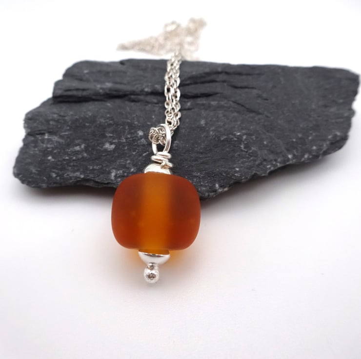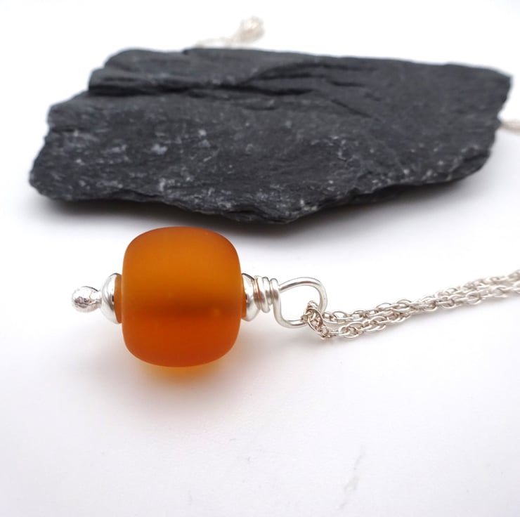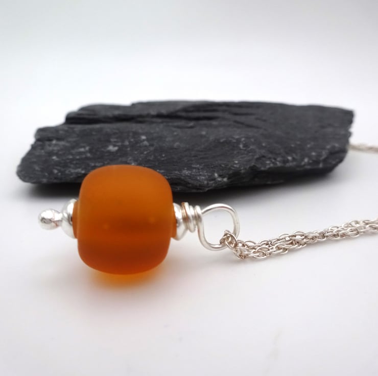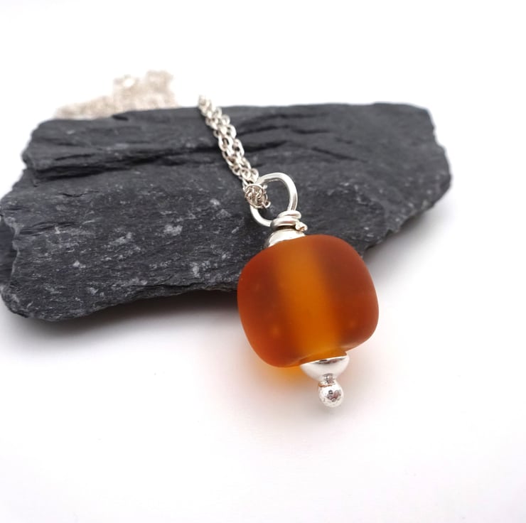 It features a handmade lampwork amber glass pendant strung onto a sterling silver chain.