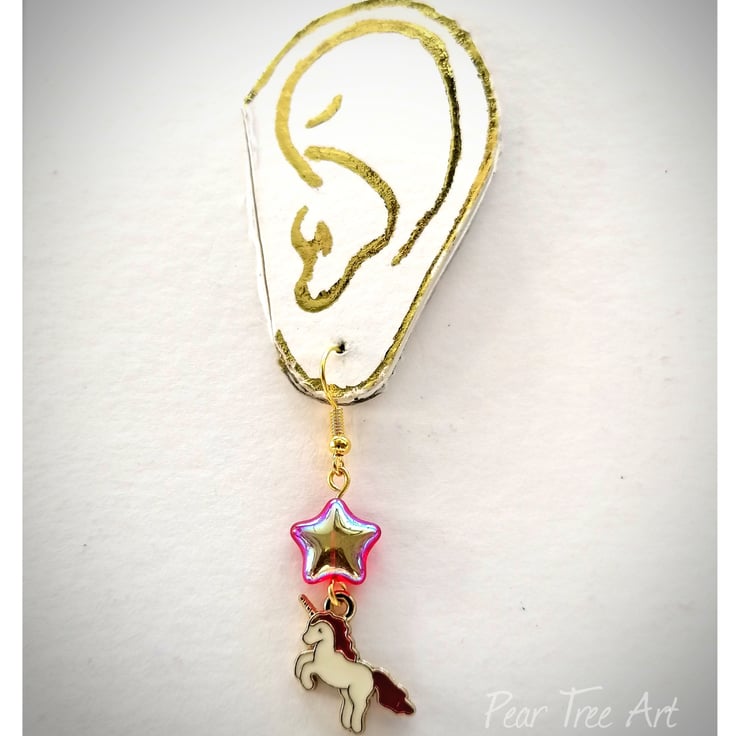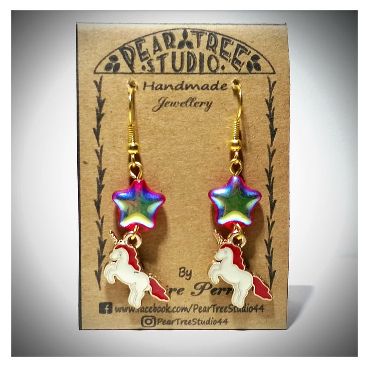 "These handmade red unicorn earrings feature delicate glass star beads, perfect for unicorn lovers or as a whimsical gift. These magical earrings add a touch of fantasy to any outfit."