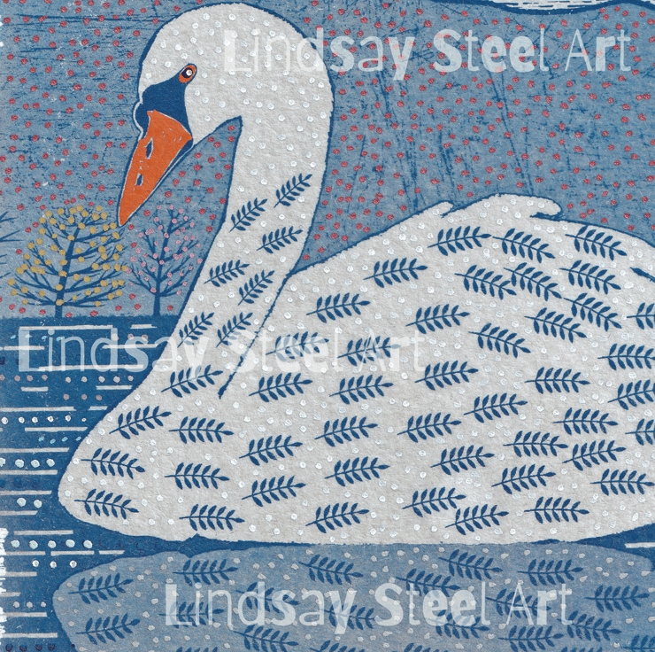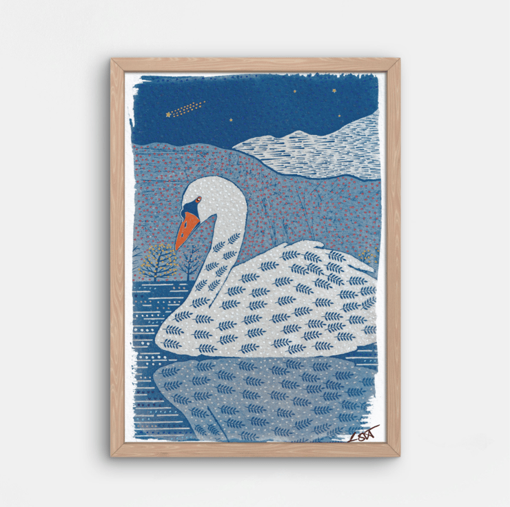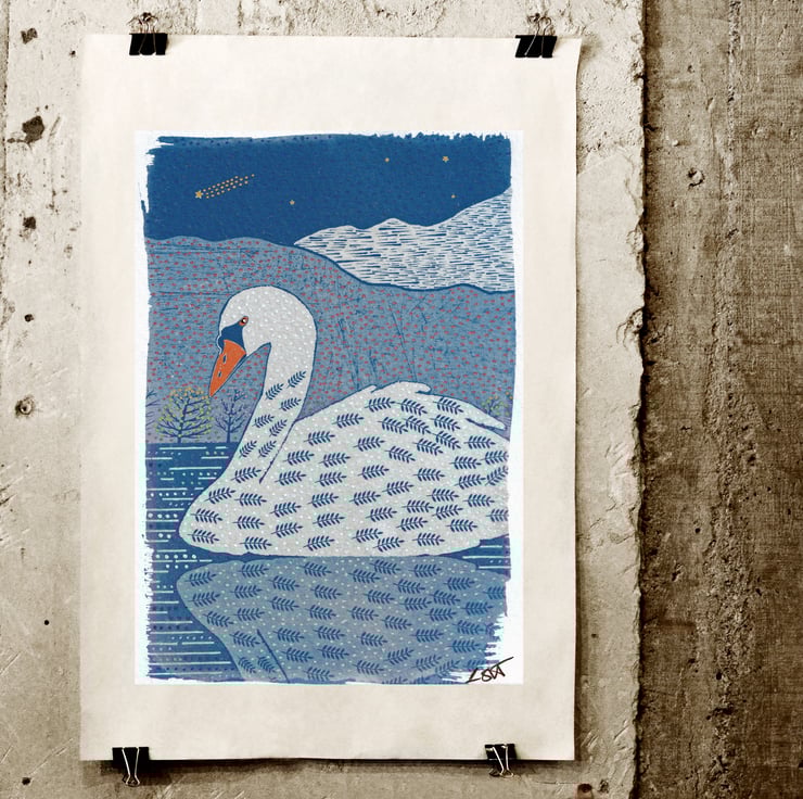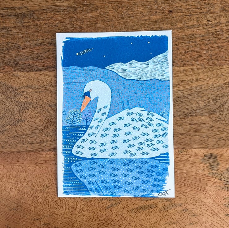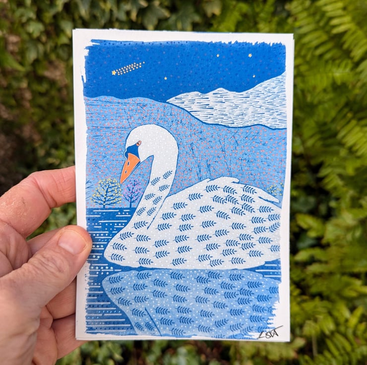 This tiny artwork is made from a cyanotype of one of my original digital paintings that has then been decorated with tiny acrylic dots. Each of these swans that I make is unique. The listing is for the artwork in the images.