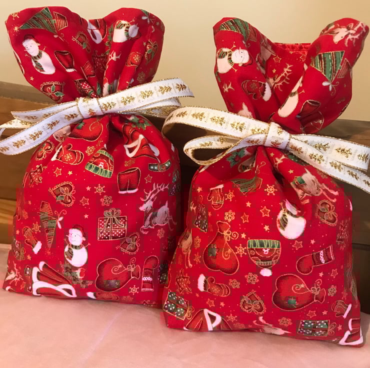 Luxury lined Christmas fabric gift bags for wrapping Xmas presents in a stylish and ethical way. These bags are completely reusable and a great way to save on paper waste