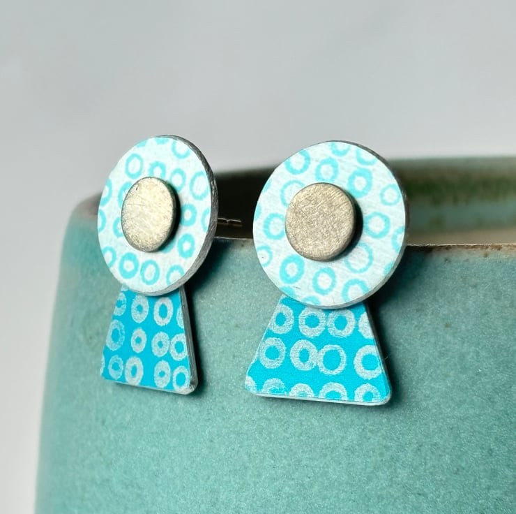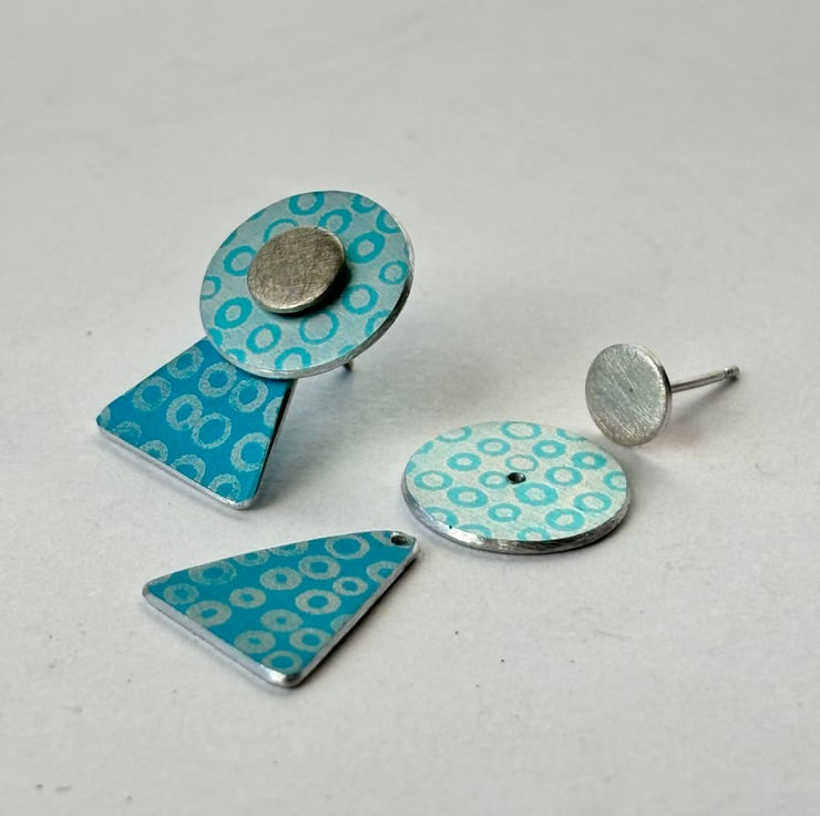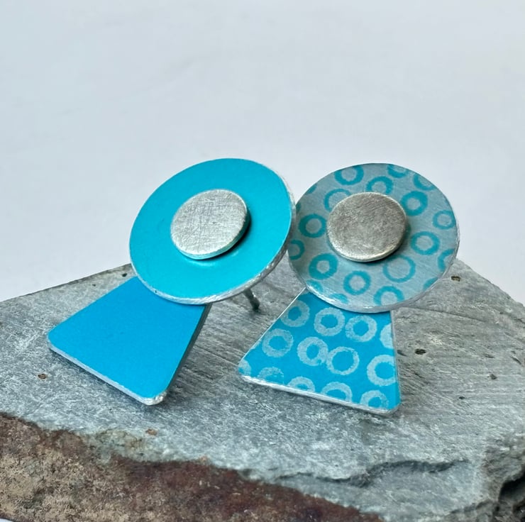 A quirky pair of earrings that can be worn in a number of ways. They are made up of 3 parts, a sterling silver circle stud, a coloured triangle and a coloured circle. These are hand crafted from anodised aluminium and are patterned on one side and plain on the other.