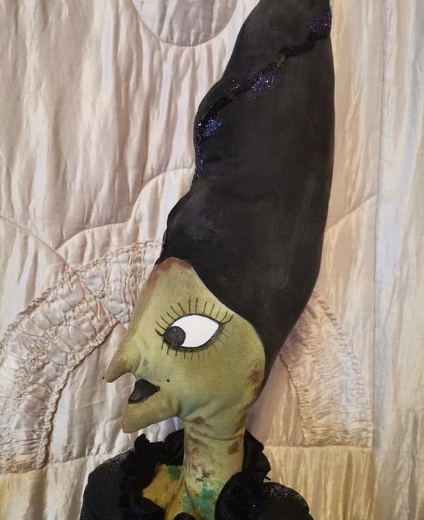 She is face forward so can be a central table display or face either way, I hand painted and drew her features and my signature mid matched art doll eyes.