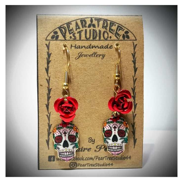 Red and Yellow Sugar Skull Earrings, Gold plated with resin enamelled design with Red metal roses on gold plated earring hooks.