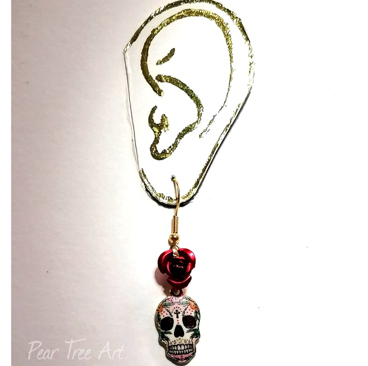 "These unique sugar skull earrings feature vibrant Red metal roses, perfect for celebrating the Day of the Dead or adding a touch of gothic elegance to any outfit. Handcrafted with attention to detail, these lightweight earrings make a bold statement for Halloween or year-round style. Ideal for those who love Boho-chic and Mexican-inspired designs.