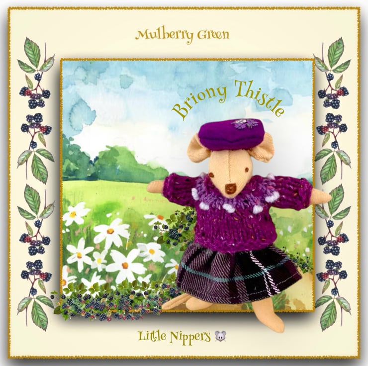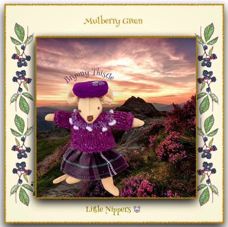 Bryony Thistle, walking in the highlands, in her purple and grey tartan skirt, green purple yoked jumper and matching sequinned beret, is one of the Little Nippers - tiny mice who live in a maze of tunnels underneath the barn at Mulberry Farm. All of the Little Nippers are named after herbs or meadow flowers. The Little Nippers are 13cm tall.