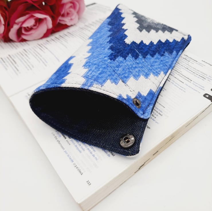 Its lined with a dark blue denim and has a dark grey popper for fastening.