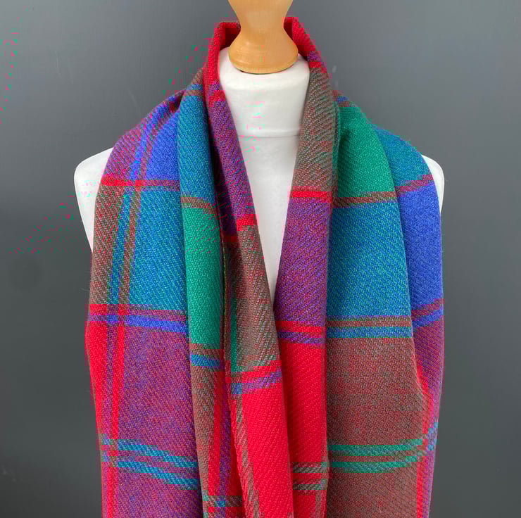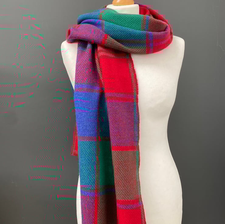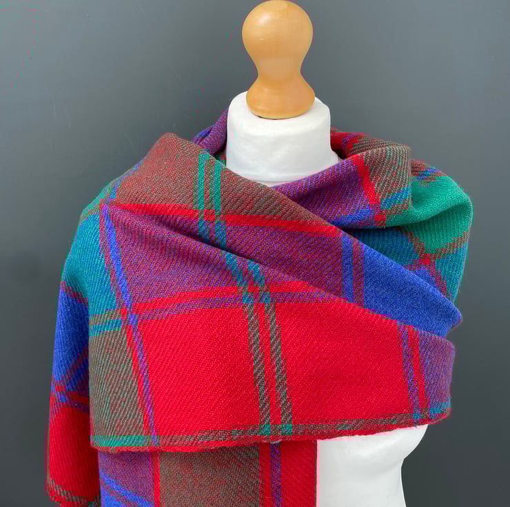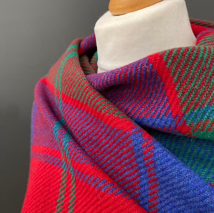 A beautiful generous tartan shawl. Woven by weaver Emma Baker on a floor loom using fine merino lambswool and the characteristic 2/2 twill weave. This shawl is beautifully soft with a lovely drape and can be worn over the shoulders or round the neck like a scarf.