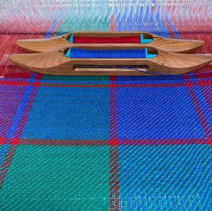 Being in need of a special gift for a friend I decided to weave a shawl in their family tartan. I wove enough fabric for three shawls. The Robertson tartan is a really lovely design with large colourblocks of the three colours. The red block is repeated twice so the overall colour of this shawl appears to be red.