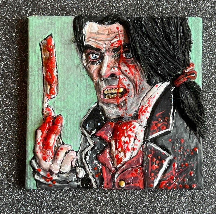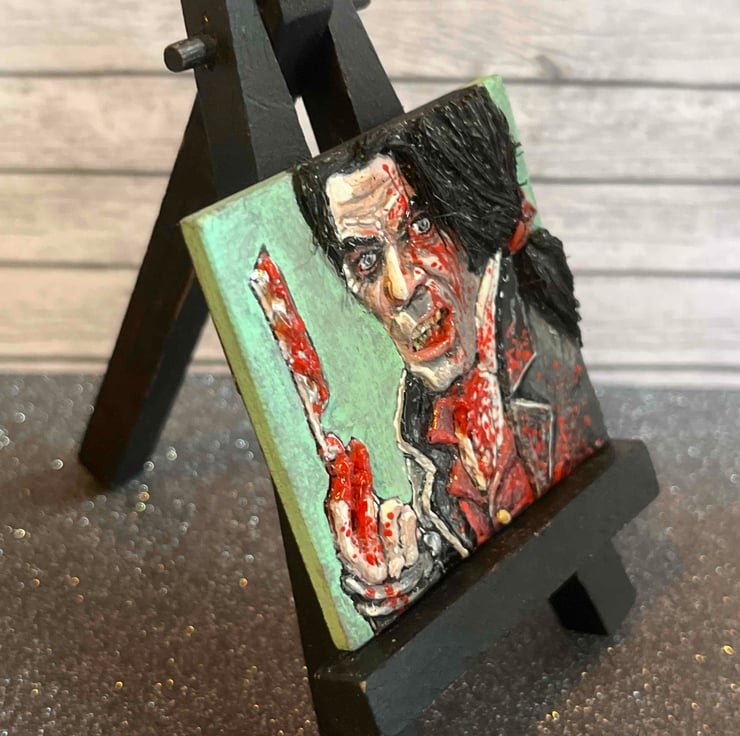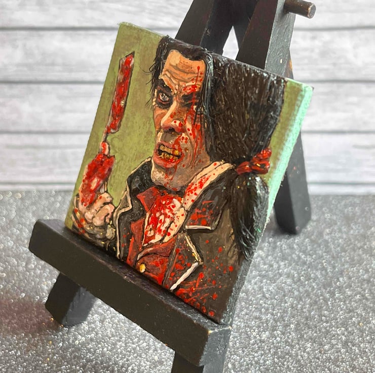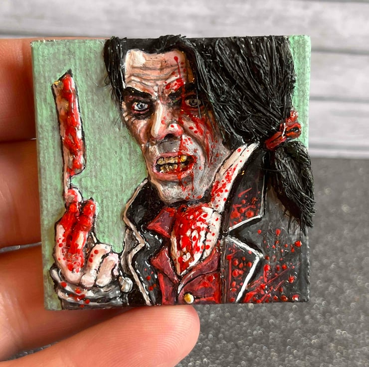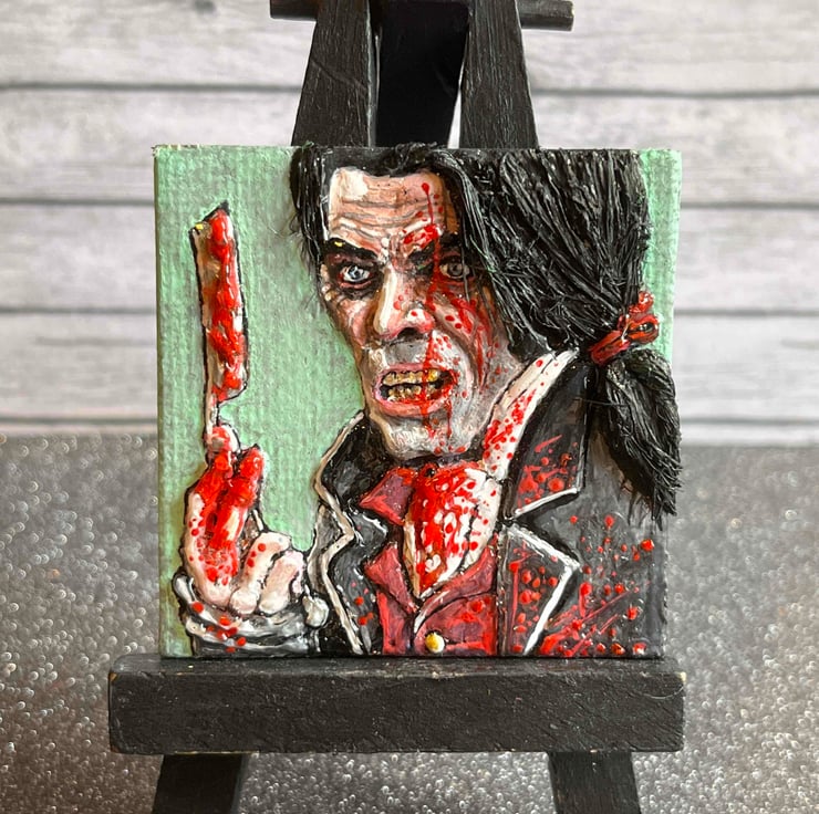 Hand painted and part sculpted Sweeney Todd (The Demon Barber of Fleet Street) mini magnetic canvas in acrylic, 3D Pearl effects (Craft resin) and synthetic hair fibre
