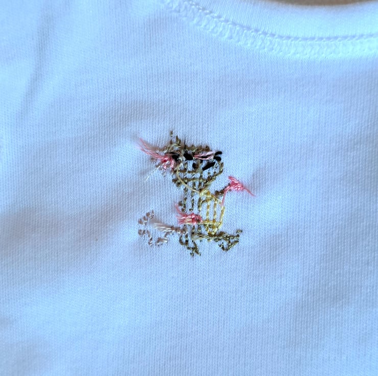 Baby vests were the first items I hand embroidered for sale at Craft Fairs, so I have been doing them for over twenty years. The mouse I first designed as one of three blind mice on a shawl. I liked him so much I opened his eye and have stitched him innumerable times since. I still love him.