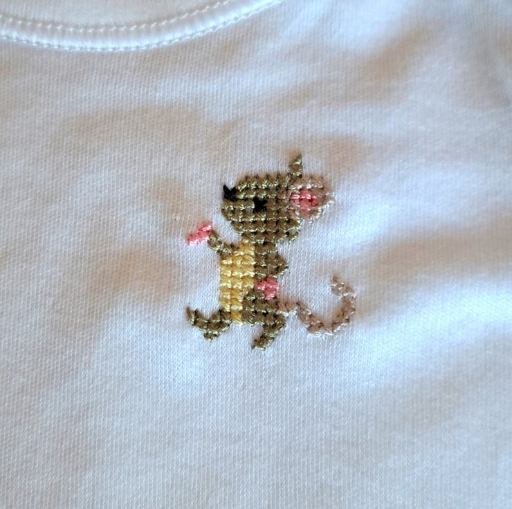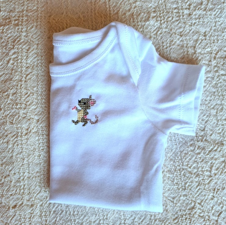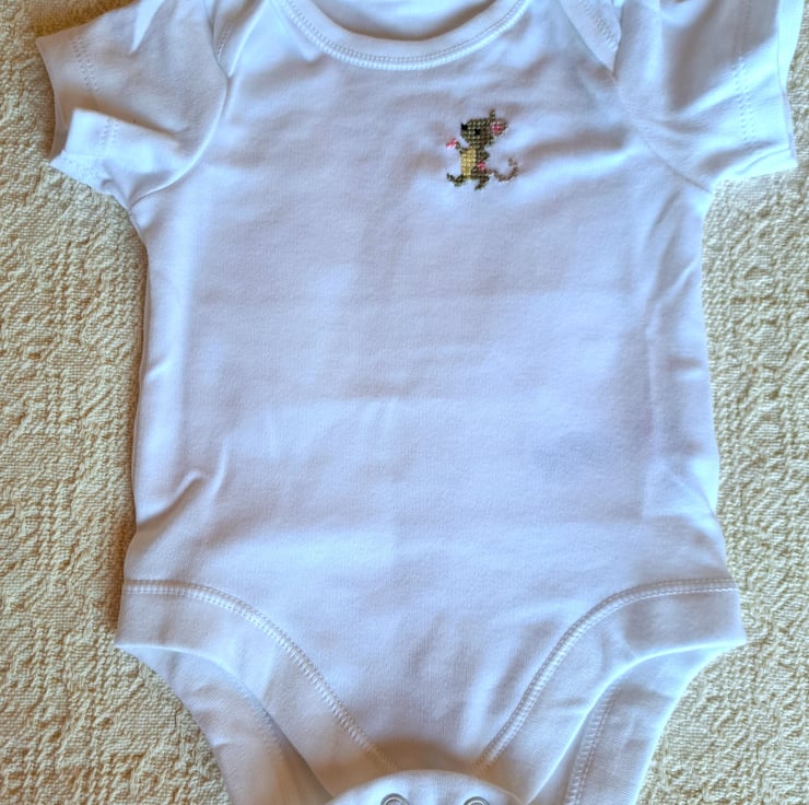 This is a sweet little white, short-sleeved baby vest or onesie, with an envelope neck and two press studs between the legs. I have hand embroidered a cheerful little brown mouse on it. As I never use a permanent backing material when hand embroidering kids' clothing, there is nothing inside to irritate your child's skin. The vest is 100% cotton and machine washable.