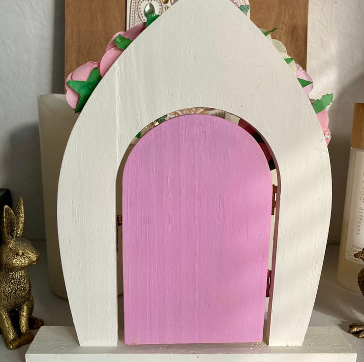 On the door is a tiny hand painted fairy who is reaching up to place the last flower on the door frame.