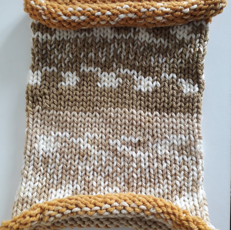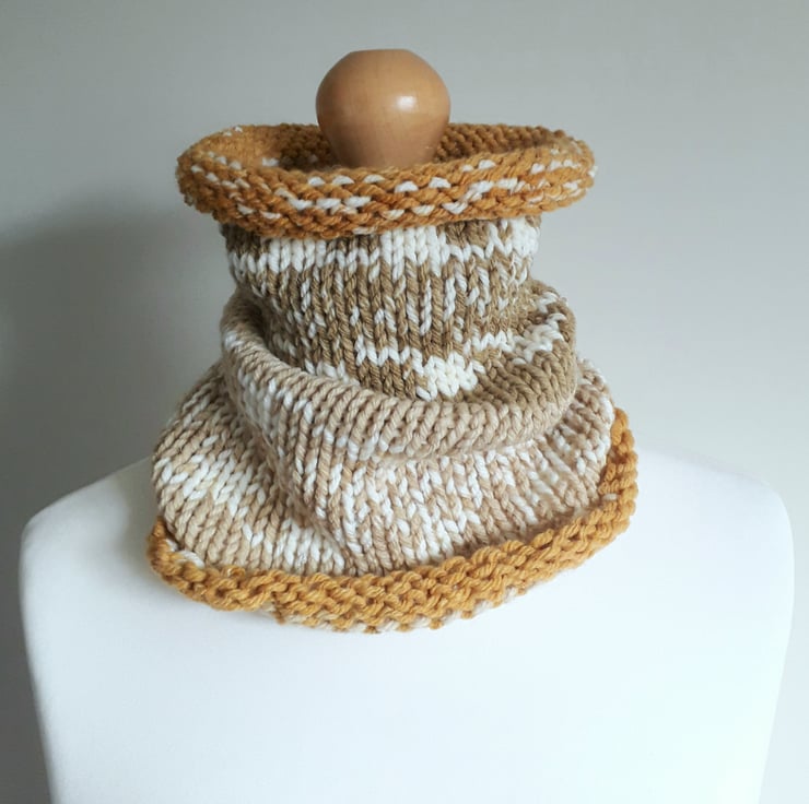 This beautiful cowl has been knitted from soft, chunky acrylic yarn in shades of mustard, fawn and cream.