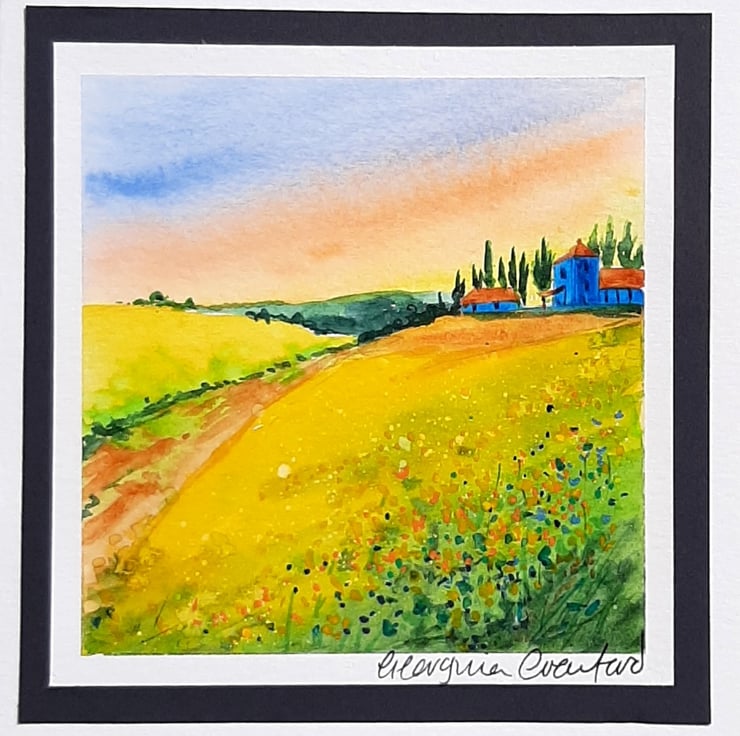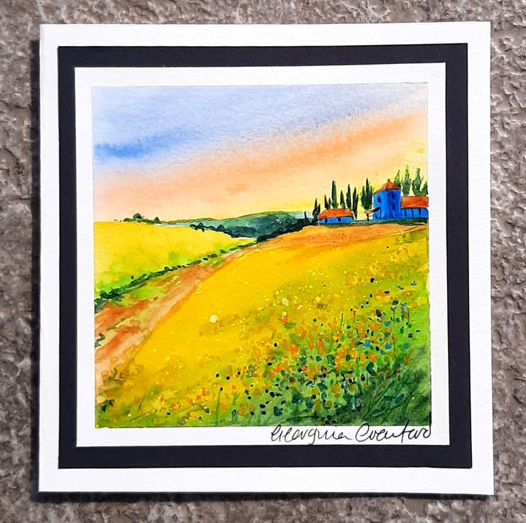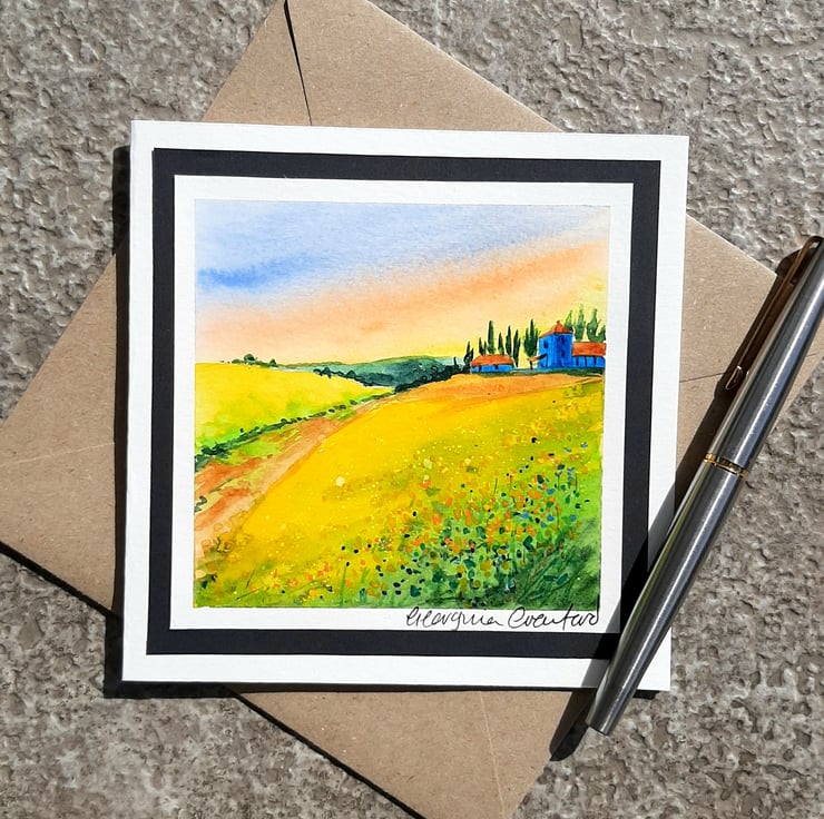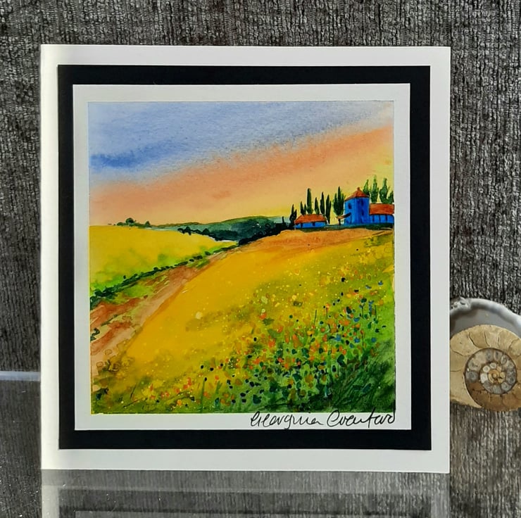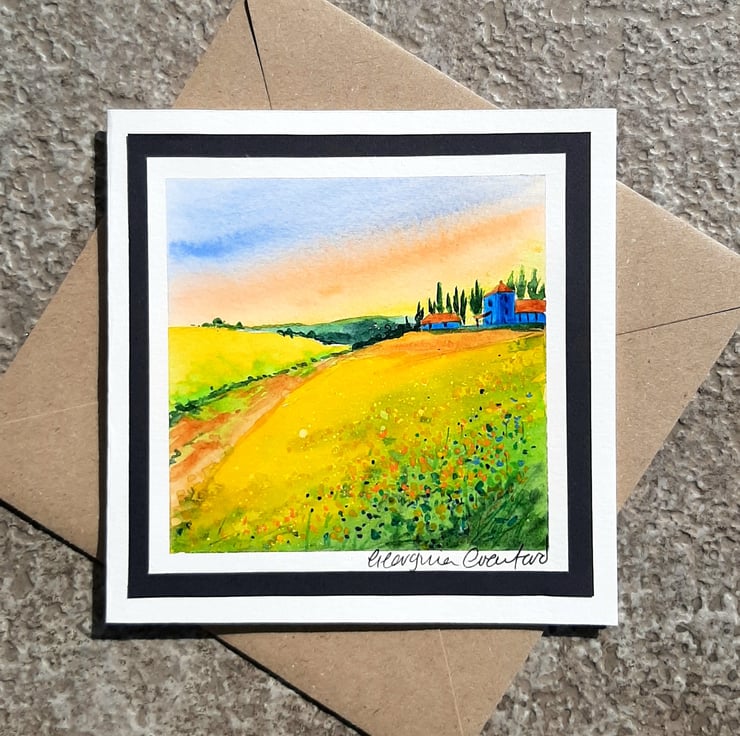 Beautiful handpainted watercolour card of a farm lane on a sunny evening.