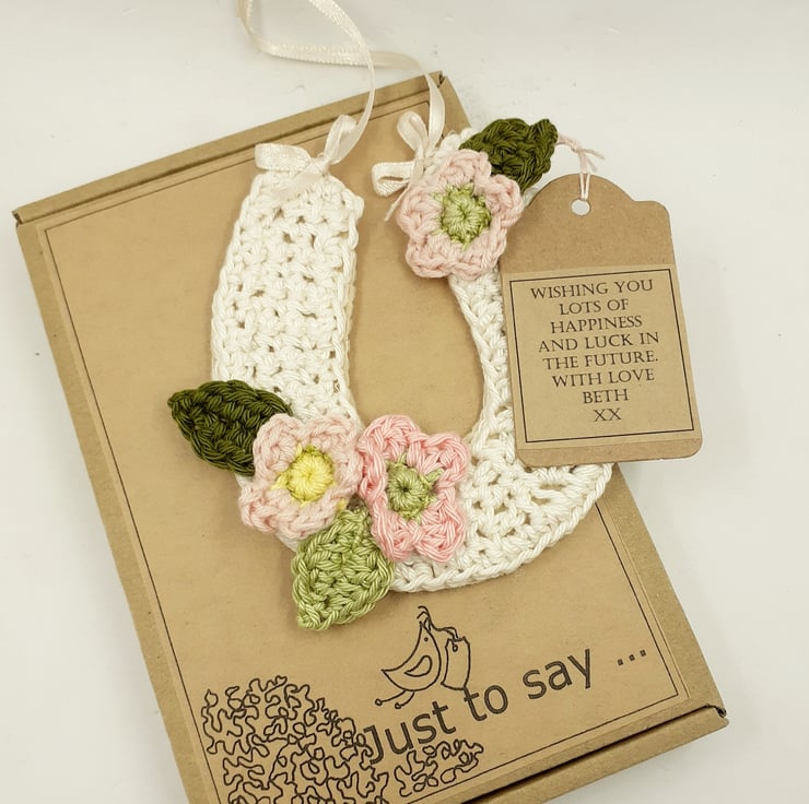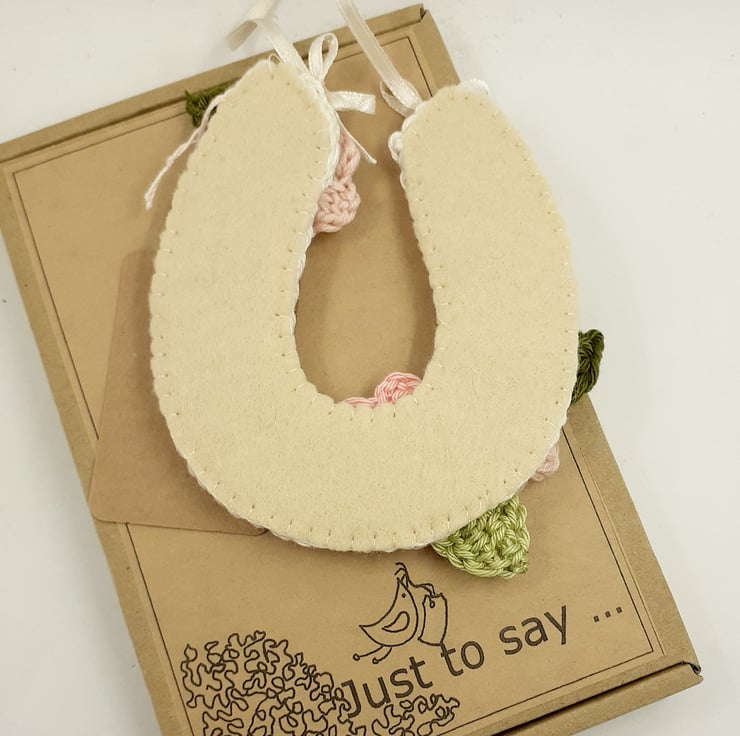 This pretty horseshoe hanger is crocheted in ivory cotton and backed with two layers of feltforstability. . It is embellished with crocheted flowers in pink and champagne and hangs from a narrow ribbon loop.choice.