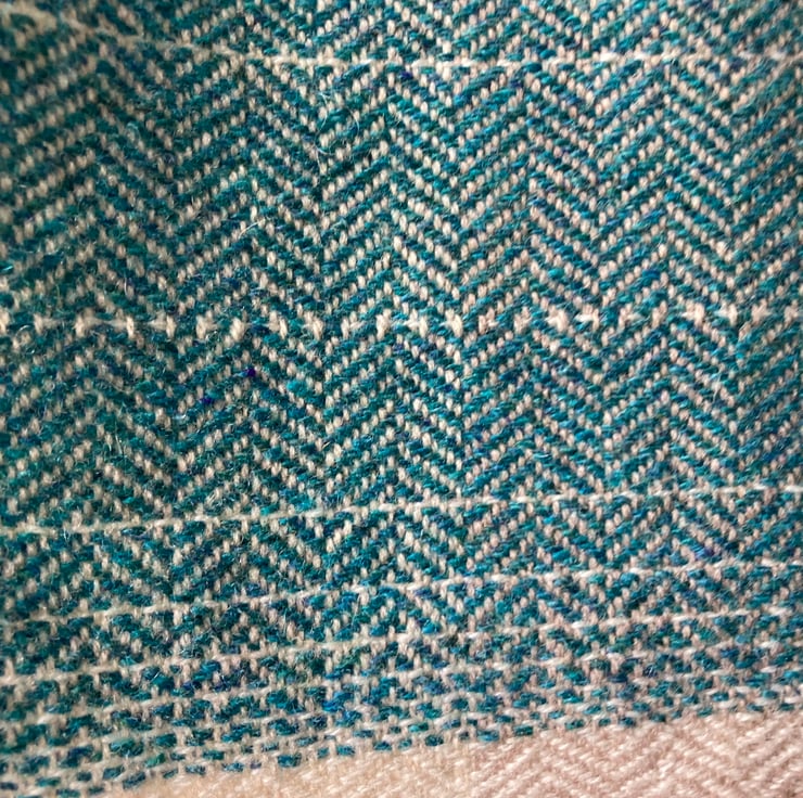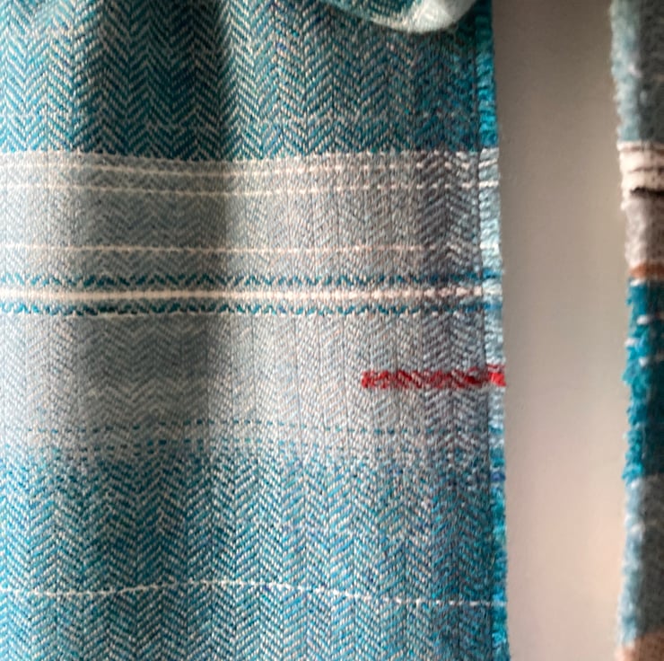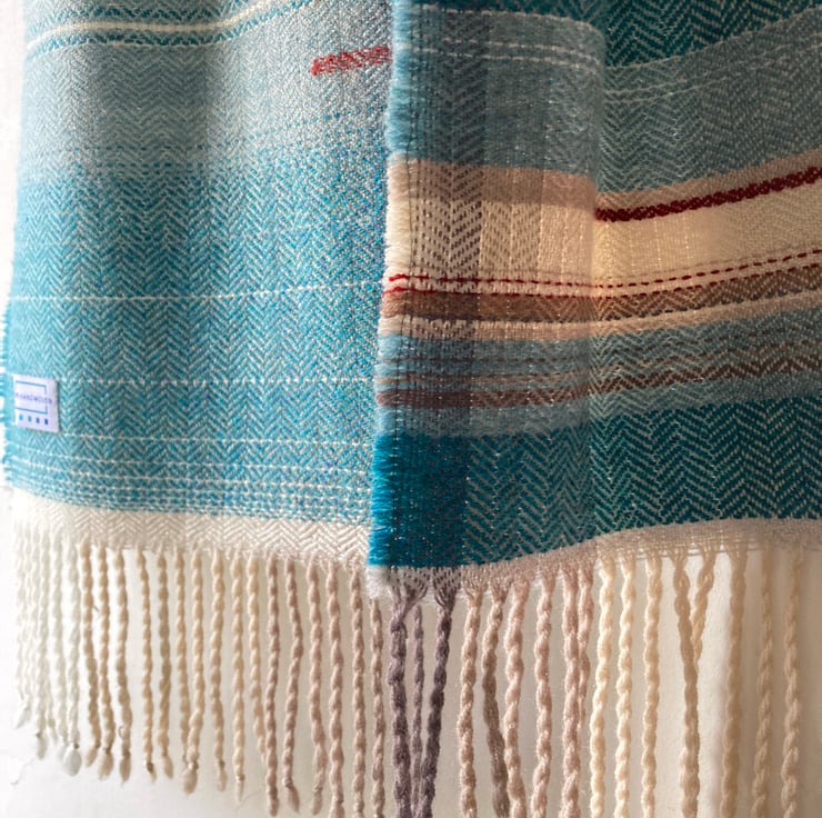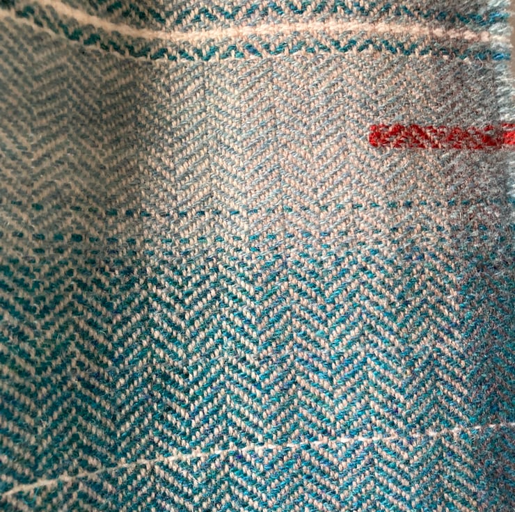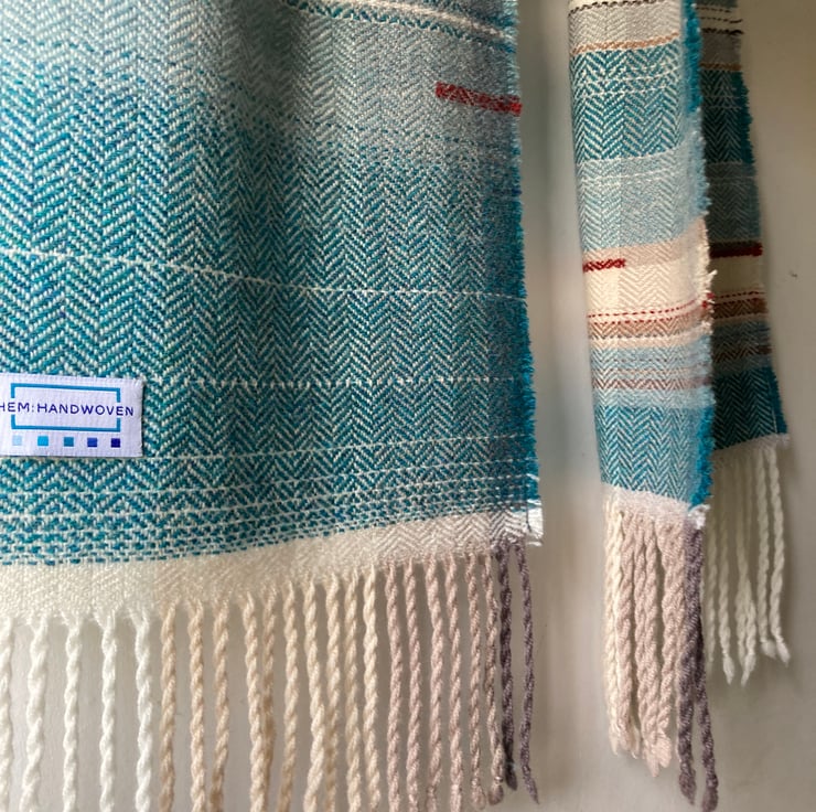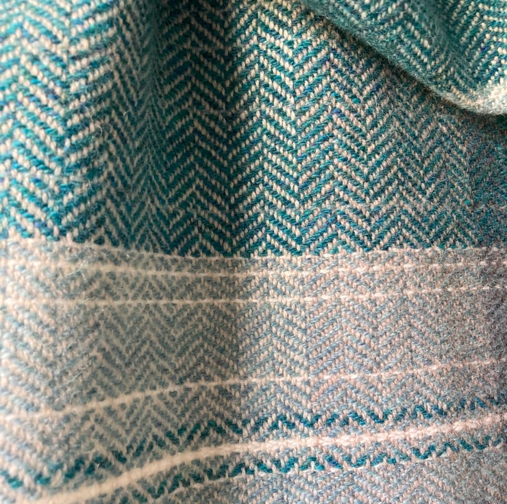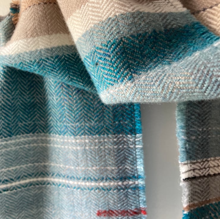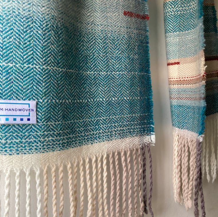 Two unique scarves in shades of teal and buff. Handwoven on two gradient warps based on the geology of landscape. Woven in a classic herringbone from Yorkshire-spun non-mulesing lambswool, they are non-itching and very light and soft. This design is also available in shades of green, heather and blue depicting other landscapes.