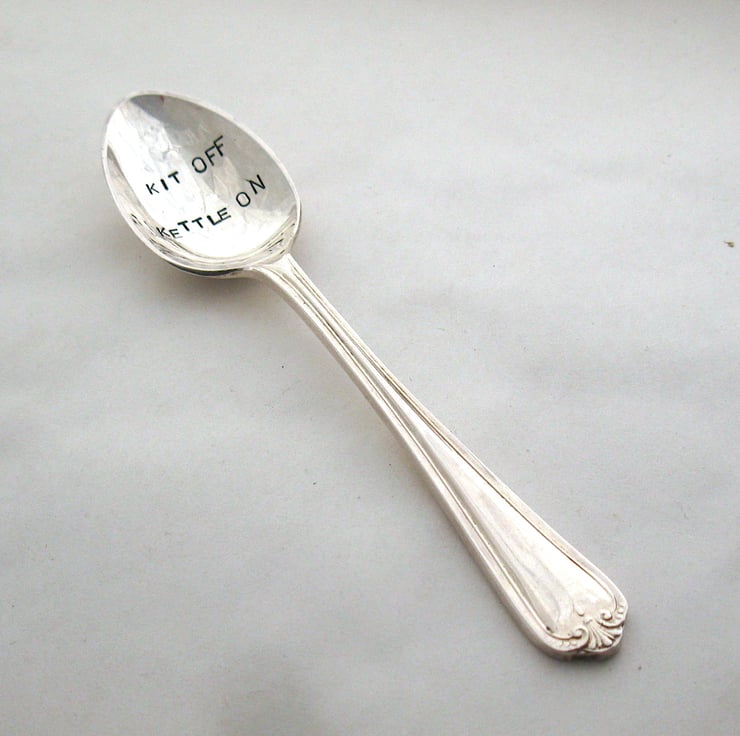 Hand stamped vintage silver-plated coffee spoon with the words 'KIT OFF KETTLE ON' in block lettering. It's the perfect gift for a coffee drinker who likes to brew in the buff and is a great addition to a campervan cutlery drawer.