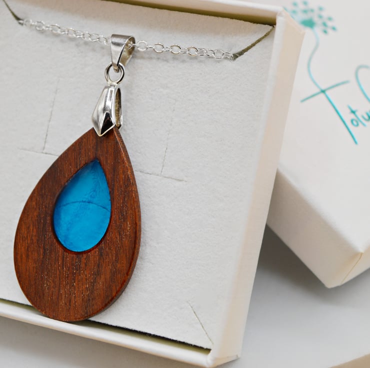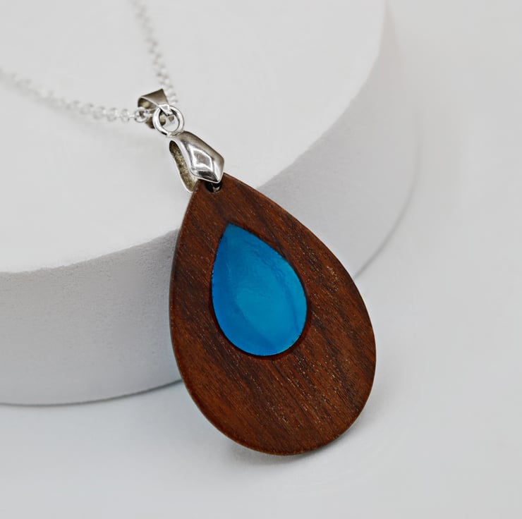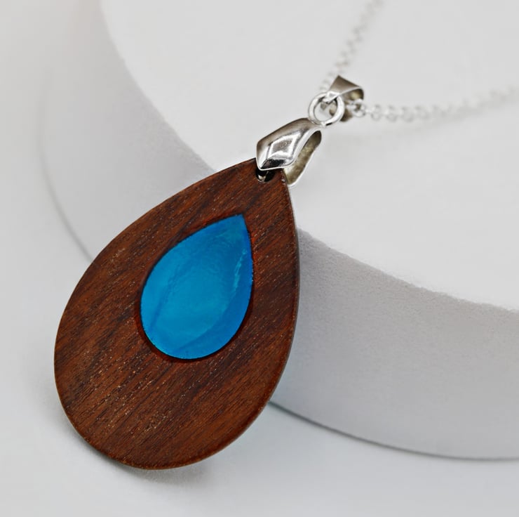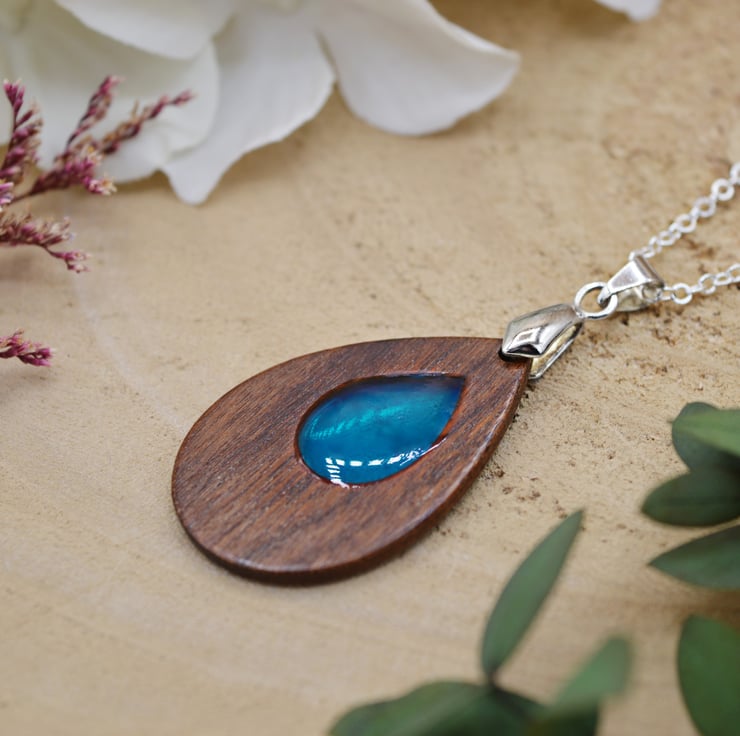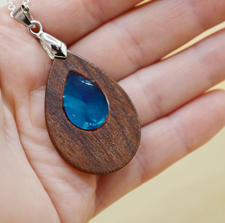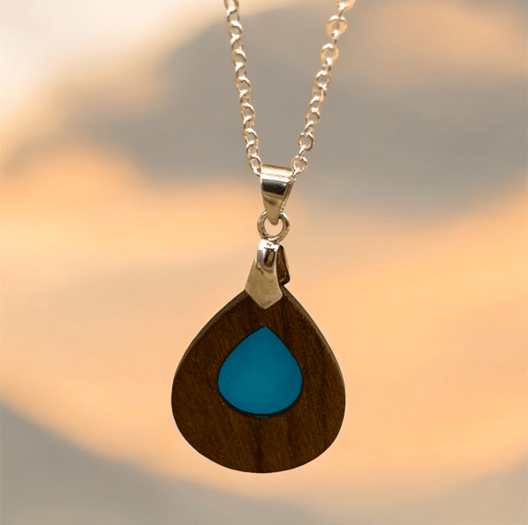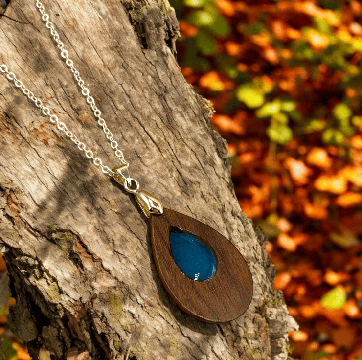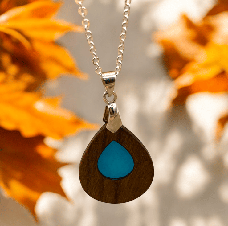 Elevate your style with this stunning pendant necklace featuring a mesmerizing blue resin inlay in rich walnut brown wood. The Silver-plated chain adds a touch of elegance to the lightweight and simple design, making it perfect for everyday wear. Stand out from the crowd with this unique accessory! Make a statement with this handcrafted pendant necklace showcasing a beautiful blue resin inlay set in warm walnut brown wood. The Silver-plated chain complements the rustic yet elegant design, creating a versatile piece that can be dressed up or down effortlessly. Embrace simplicity and sophistication with this one-of-a-kind necklace. Add a pop of colour to your outfit with this elegant pendant necklace crafted from walnut brown wood and accented with a striking blue resin inlay. The lightweight and minimalistic design make it a go-to accessory for any occasion. Complete your look with this versatile piece that seamlessly blends style and comfort.