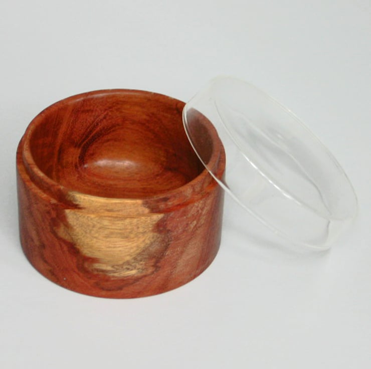 A simple but pretty little glass lidded trinket pot turned in bubinga an exotic hardwood. Ideal for the dressing table and somewhere to put those precious things at the end of the day.