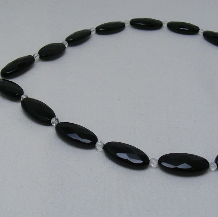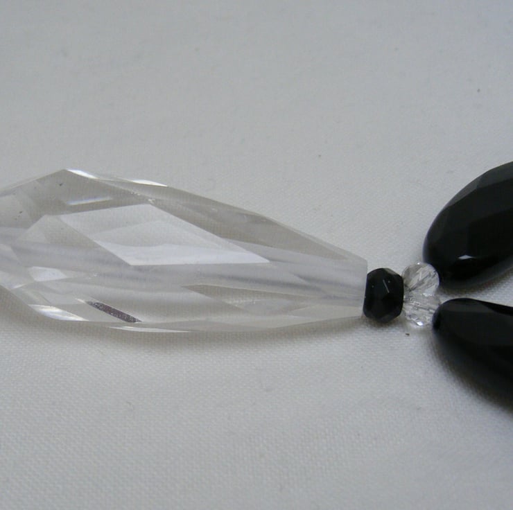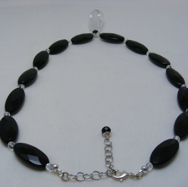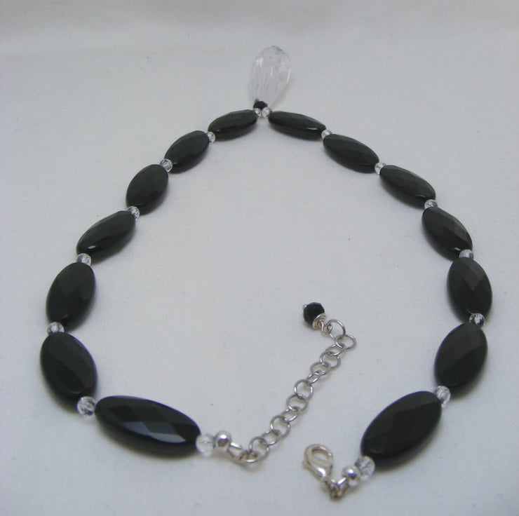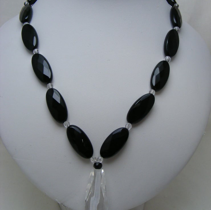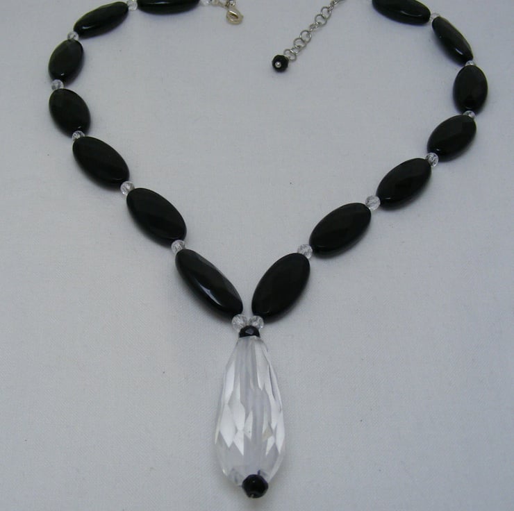 This beautiful necklace is one of a kind, and handmade using, 25x12mm Black agate ovals, 42x15mm clear quartz drop, 4mm crystal rounds, 5x4mm black agate rondelles and silver plated findings. Necklace would make a beautiful gift.