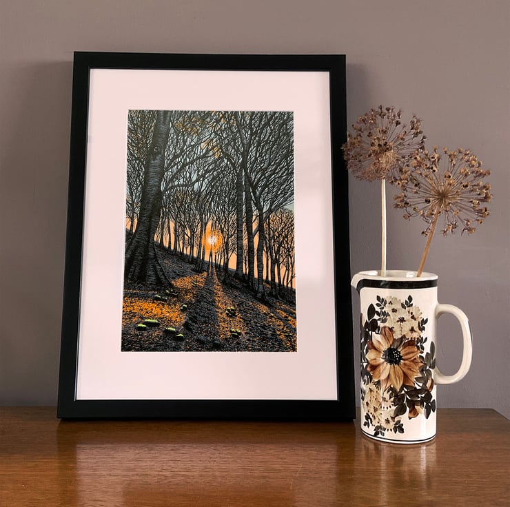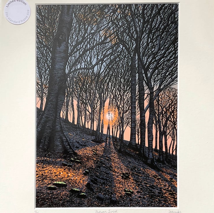 A hand-pulled screen-print called ‘Autumn Sunset’.