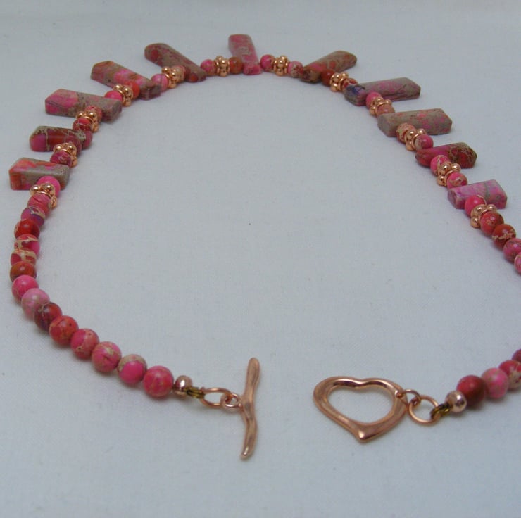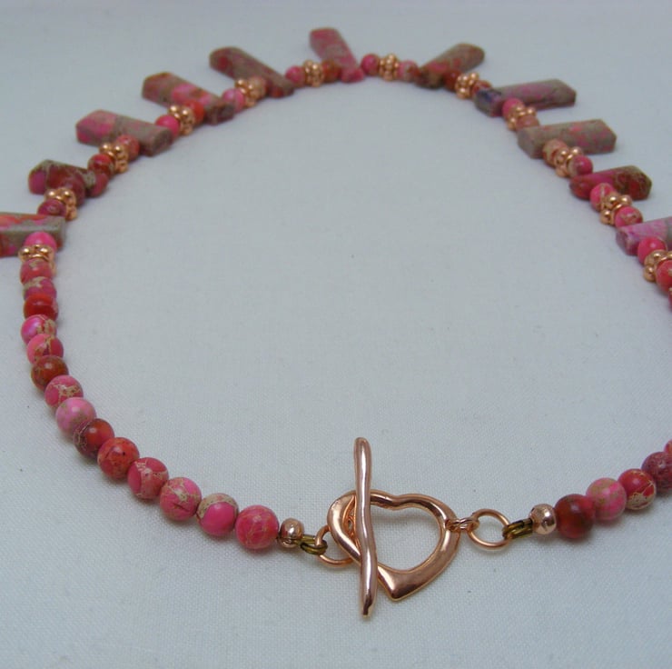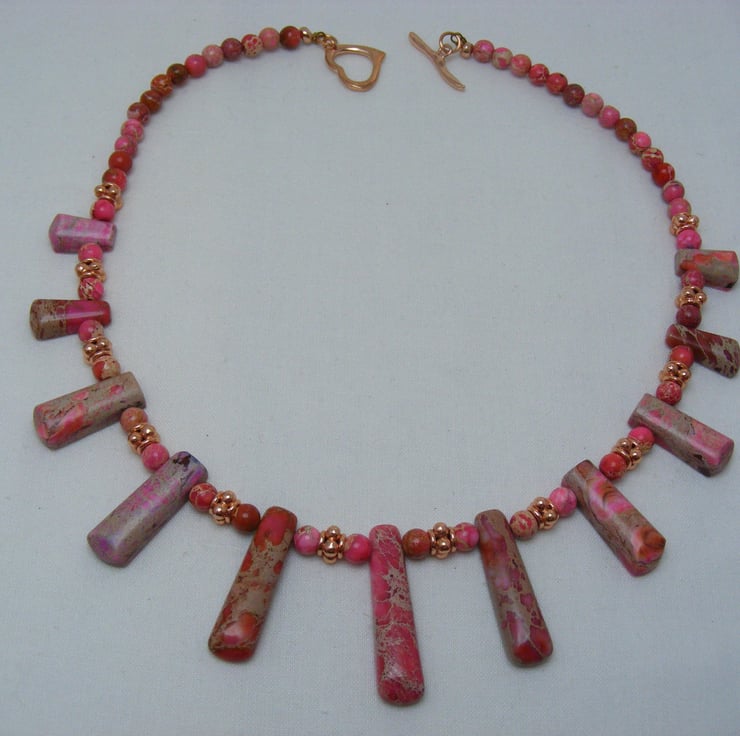 One of a kind necklace, handmade with, graduated pink sediment jasper bars, 6mm pink sediment jasper rounds, 5mm rose gold plated spacers and Rose gold findings.