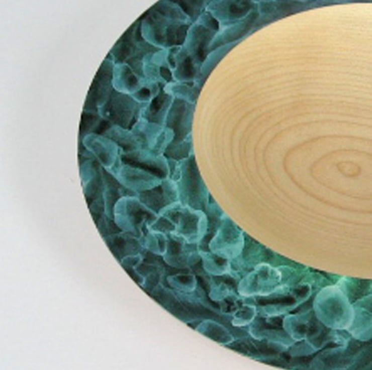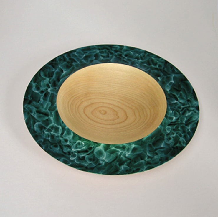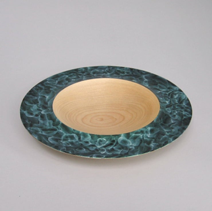 Firstly, I turned this pretty, decorative platter in Sycamore. I then applied a sparkling, iridescent finish to the rim. Finally the dish was given a hard wearing lacquer that simply requires a damp cloth to keep clean.