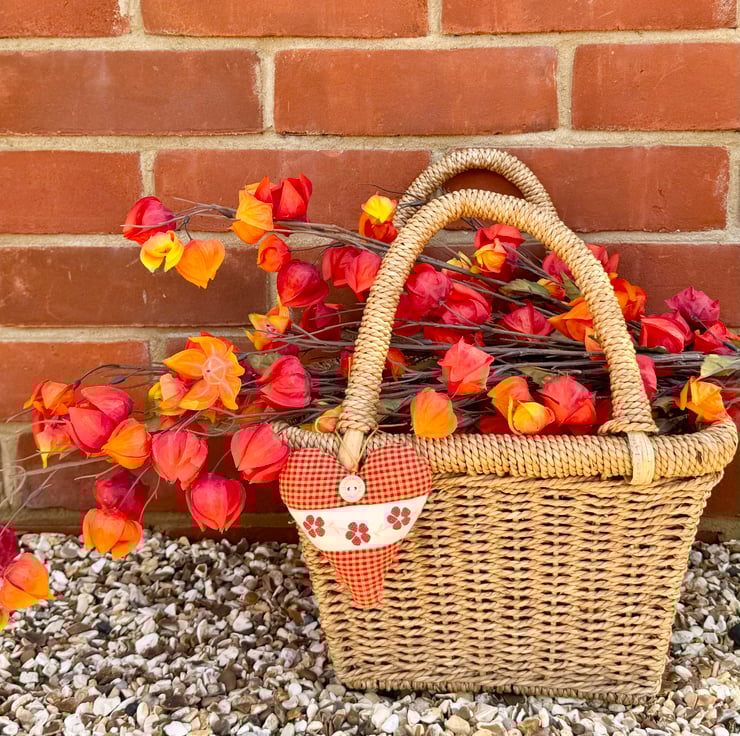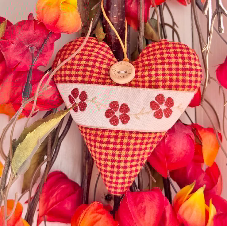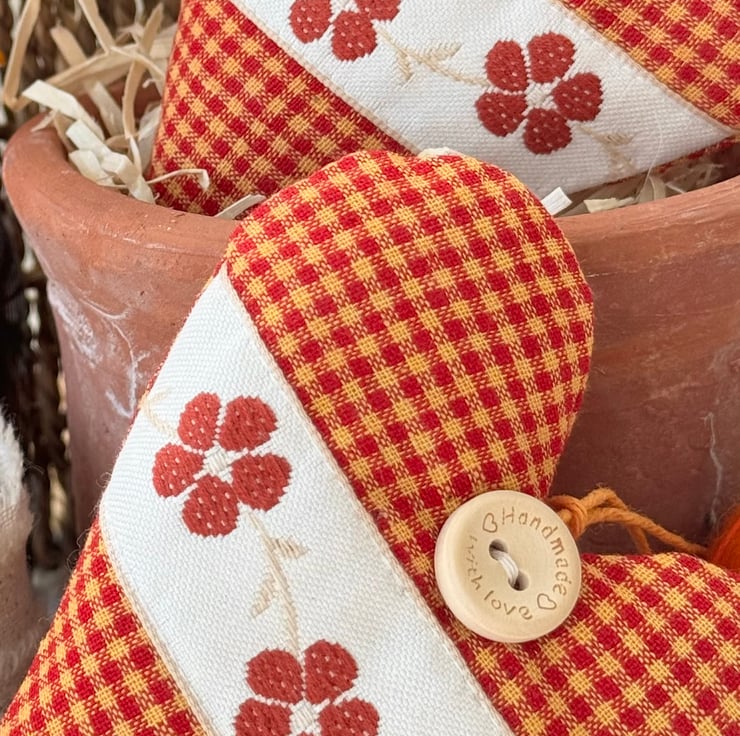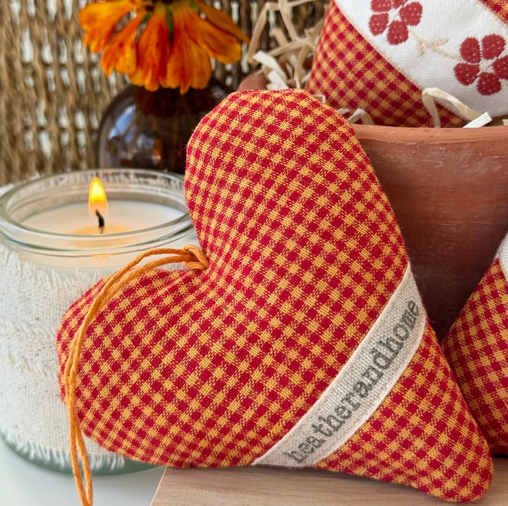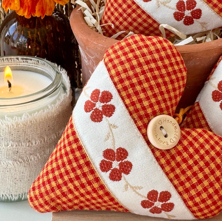 Gingery-orange and russet-red mini checks are on both sides of this woven cotton heart. And a beautiful ivory ribbon band featuring a garland of dark red vintage flowers, runs across the front. Generously filled with fragrant Hampshire lavender, each heart decoration is finished with a round wooden button bearing the legend 'Handmade with love' and has orange hemp twine hanging cords - ready to tie onto kitchen dresser hooks, coat pegs, window latches, basket handles, bedposts and doorknobs.