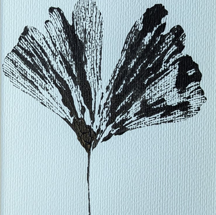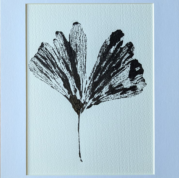 An original 1/1 print taken directly from a Ginkgo biloba leaf onto 300gsm watercolour paper using black acrylic paint. The print is mounted onto thick carboard and surrounded by a picture mount. The total size of the print and mount is 25.2cm by 20.2cm (10 by 8.0 inches) . The print itself excluding the mount measures 19.2cm by 14.5cm (7.5 by 5.7 inches). The print is signed 'DAS' on the back and is named and numbered 1/1. It is an ideal purchase/gift for anyone interested in plants or botancial art, especially trees.