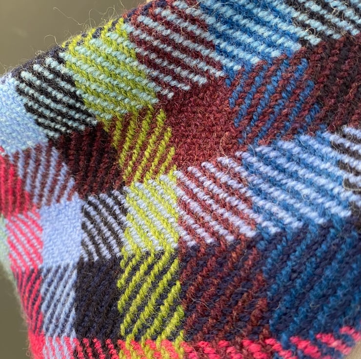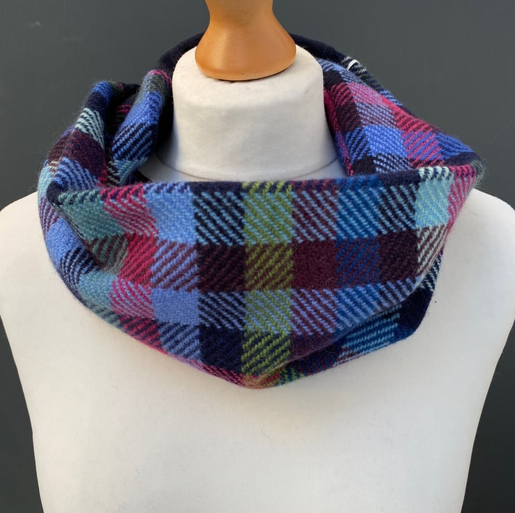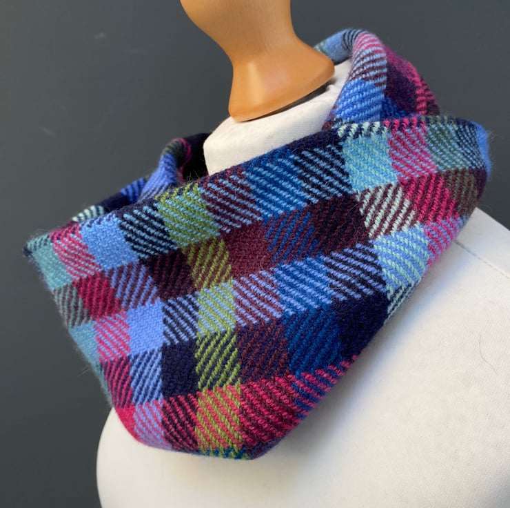 Be warm and stylish with this handwoven luxury snood. Woven with fine merino lambswool in navy, blue, green and pink shades. Created on a floor loom using a 2/2 twill design. After weaving the fabric has been sewn into a tube with an infinity twist along with a small piece of navy knitted lambswool fabric. A luxury handcrafted luxury gift.