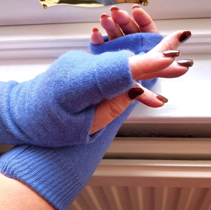 This is a pair of recycled cashmere fingerless gloves that keep your wrists and hands warm while freeing your fingers. They are made from 100% cashmere garments that I have repurposed. These garments are used cashmere cardigans and jumpers which I wash, slightly felt and de-bobble to make the fabric beautiful again. This pair of sky blue fingerless gloves will keep your hands warm in lightweight, luxurious cashmere. They would also make a wonderful gift for someone!