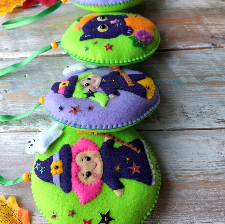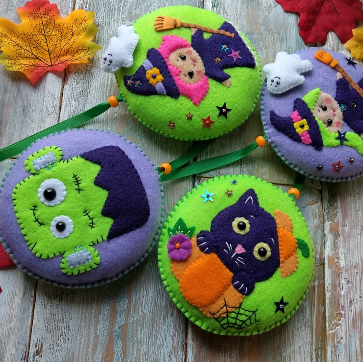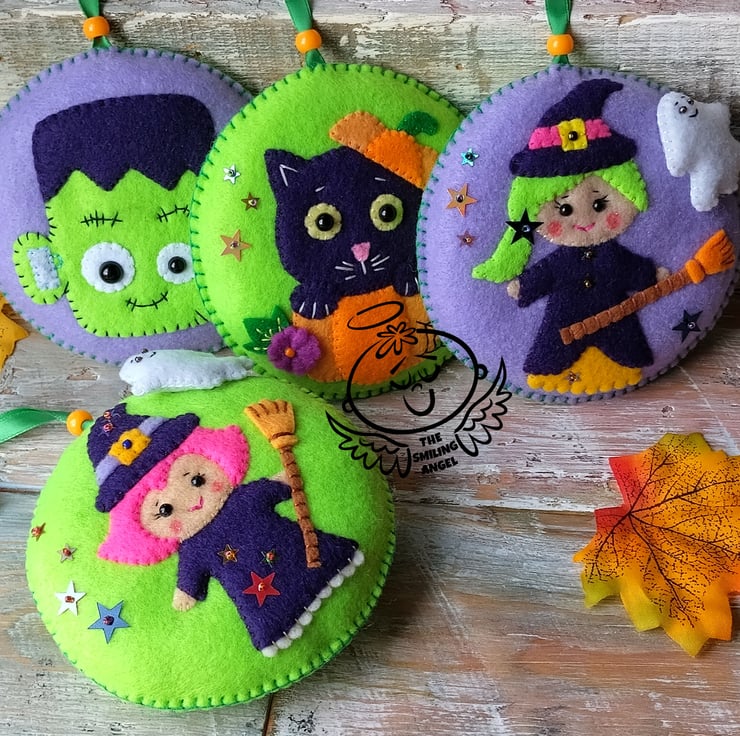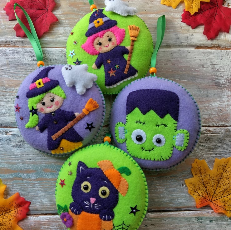 These handmade felt Halloween ornaments perfect for adding a bit of fun to your décor. Each piece, featuring a cute witch, Frankenstein, and black cat, is meticulously hand-cut and sewn with care. These adorable ornaments make a delightful Halloween gift. Please note these decorations are not meant to be used as toys.