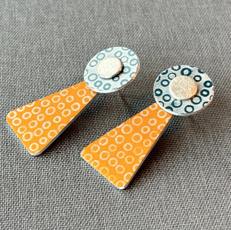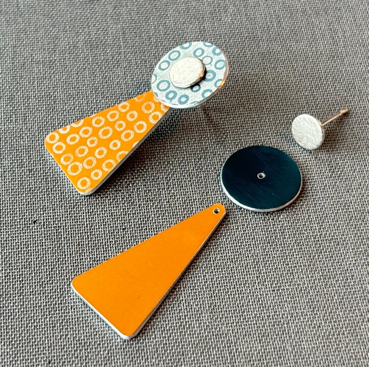 A quirky pair of earrings that can be worn in a number of ways. They are made up of 3 parts, a sterling silver circle stud, a long coloured triangle and a coloured circle. These are hand crafted from anodised aluminium and are patterned on one side and plain on the other.