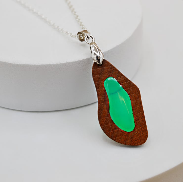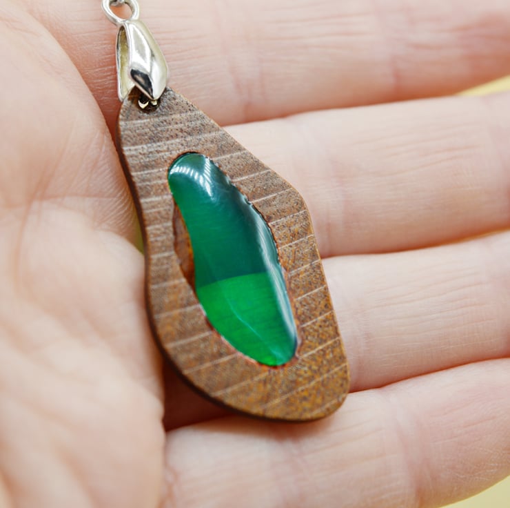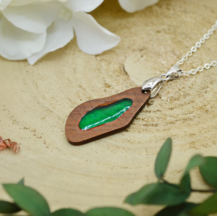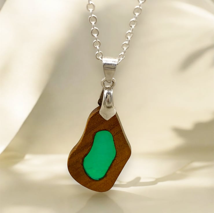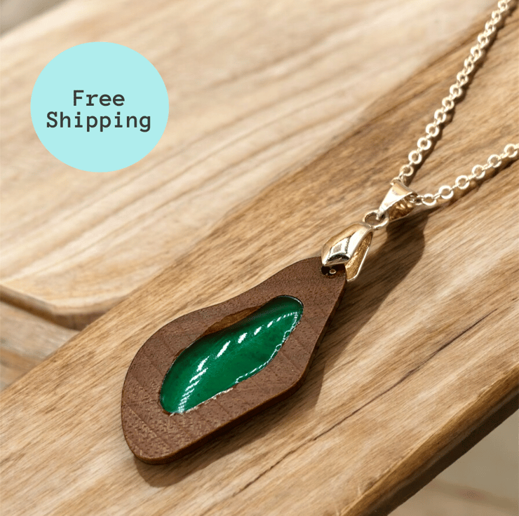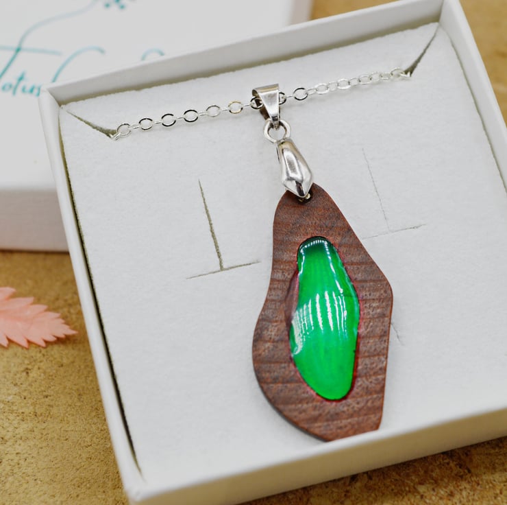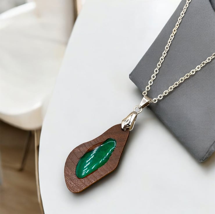 Elevate your accessory game with this stunning green resin and walnut brown wood pendant. This abstract lightweight pendant showcases a simple design, perfect for adding a modern touch to any outfit. Crafted with care, it combines the natural warmth of walnut wood with the vibrant hue of resin, making it a unique statement piece. Ideal for everyday wear or special occasions, this pendant is a must-have for any jewellery collection. Shop now to embrace a blend of nature and artistry!
