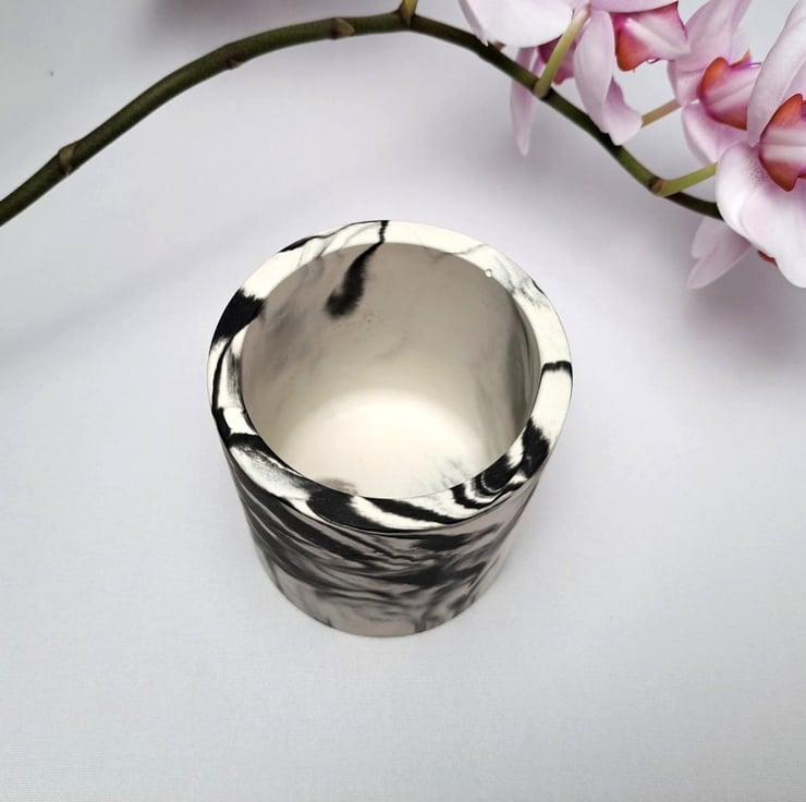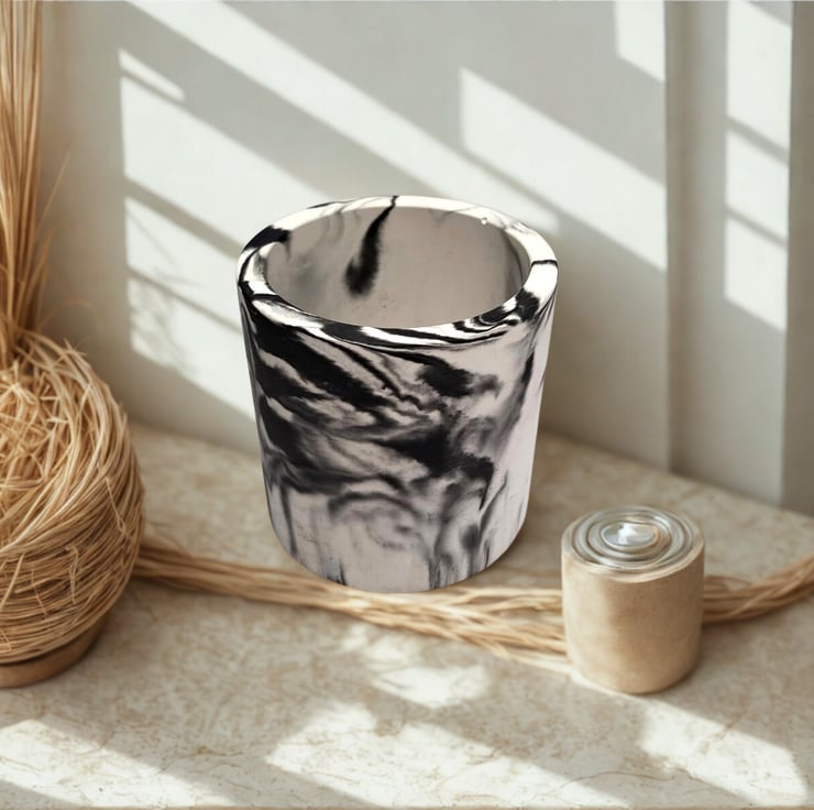This handcrafted stonecast piece features a sleek, tall, and narrow form with a striking black and white marbled design. The swirling pattern creates a bold yet elegant aesthetic, perfect for modern or minimalist interiors.