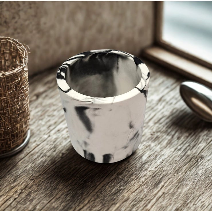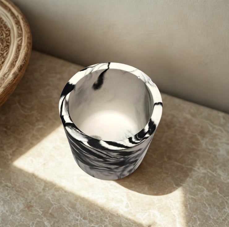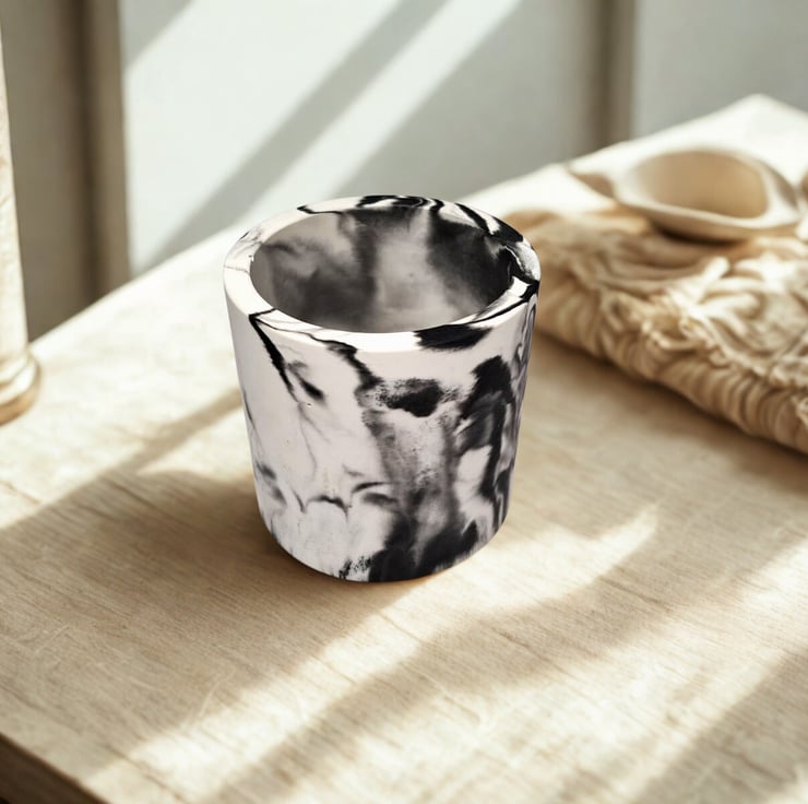 The inspiration behind this handcrafted stonecast piece with a black and white marble-like appearance comes from the timeless elegance and dramatic contrast found in classic marble. The design reflects a modern, sophisticated aesthetic, perfect for those who appreciate a blend of bold style and refined craftsmanship. This piece is crafted to embody the grace and versatility of marble while offering a functional accent for contemporary spaces. The combination of sleek lines and striking colors aims to bring a touch of high-end elegance and artistic flair into your home.