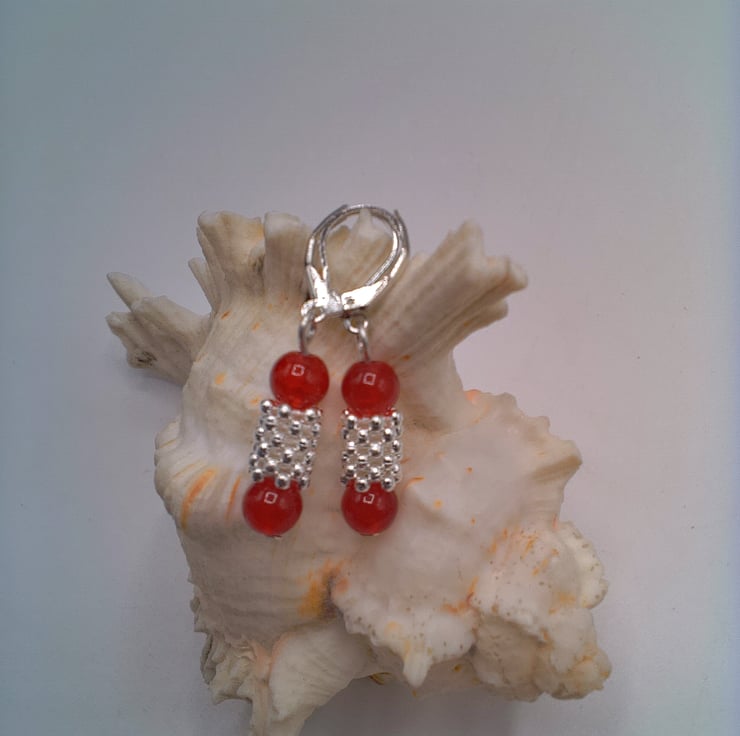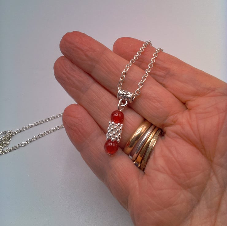 This pretty jewellery set comprises a necklace, bracelet and pair of earrings which is light and easy to wear. It would look great for a special day out or evening get together. The pendant is made using two 8 mm round cherry red glass beads and six 6 mm silver plated snowflake spacer beads suspended on an 18 inch silver plated chain fastened with a silver plated lobster clasp. The bracelet uses the red glass beads and silver plated snowflake spacer beads threaded onto jeweller's elastic. The earrings use the same beads used for the pendant and they are suspended on silver plated lever backs. The necklace is 18 inches (46 cm) in length, the bracelet is 7 inches (17.25 cm) in diameter and the earrings have a drop of 0.75 inch (2 cm) from the base of the ear wire. The jewellery set will be dispatched wrapped in tissue paper in an organza bag and be delivered via Royal Mail first class post. The set would make a lovely gift for a jewellery loving lady.