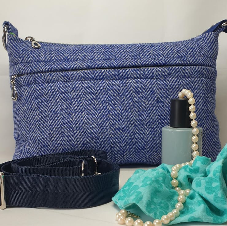 Gorgeous herringbone Yorkshire tweed crossbody bag in Waterloo Blue with a stunning cotton lining. This 100% wool tweed is named after a Yorkshire village district; it is naturally renewable, biodegradable and recyclable.
