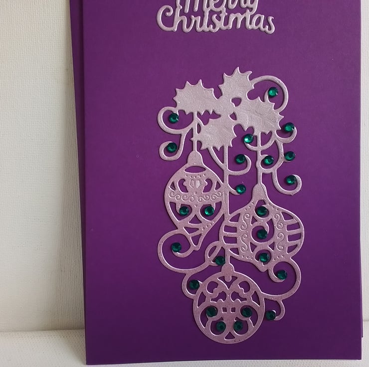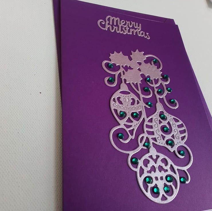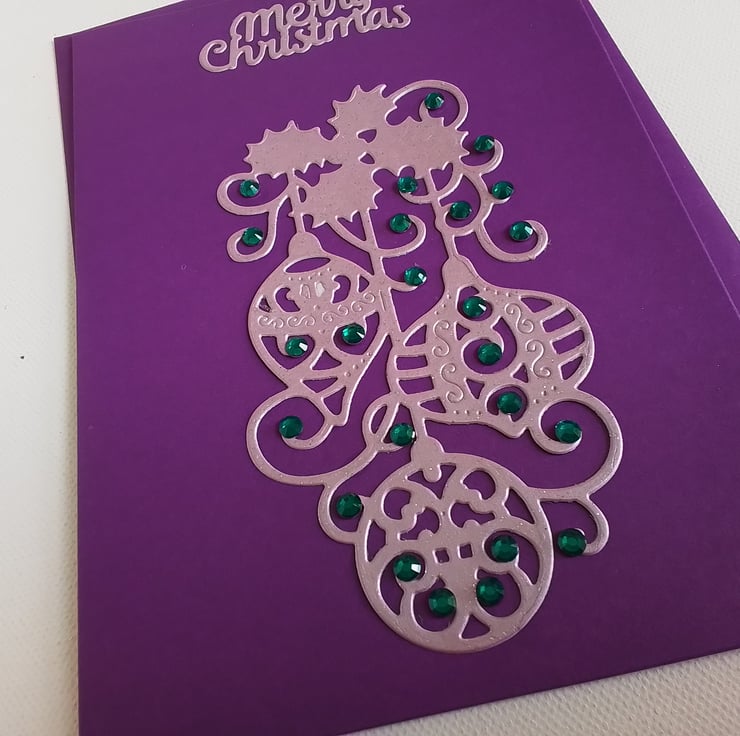 Contemporary Christmas card with die cut baubles in a shiny pink and teal beads on a purple card.