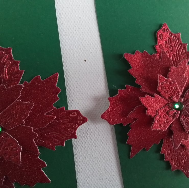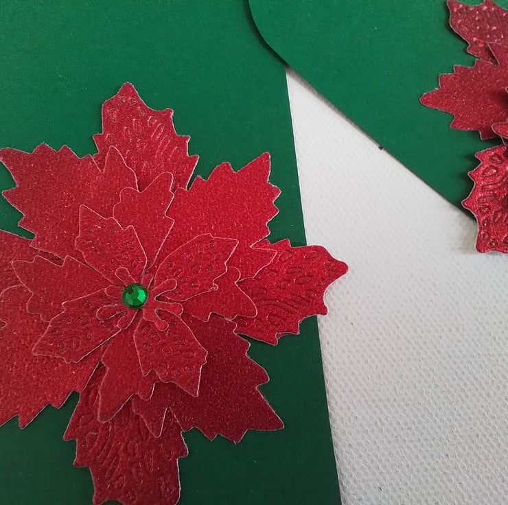 Each is in a deep green with a red, shiny poinsettia with a green bead in the centre.