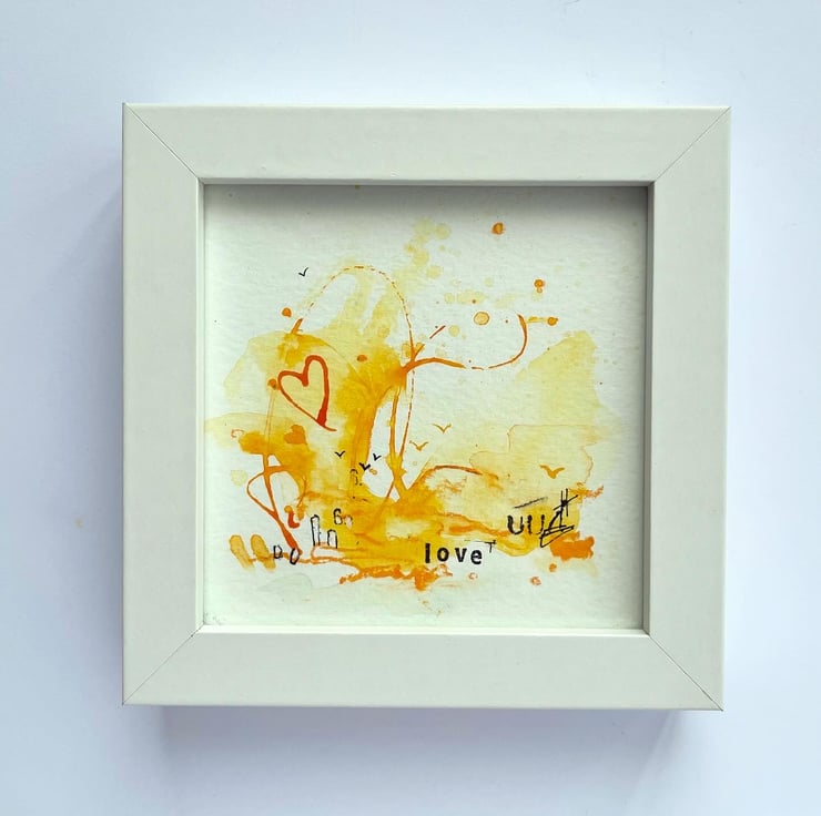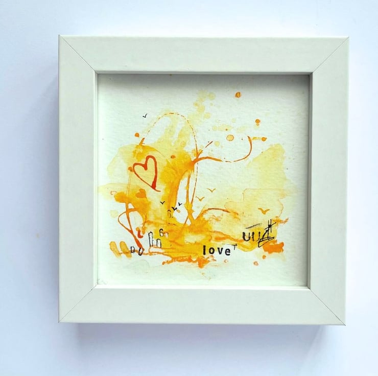 It's a small, original abstract painting, framed to 12cm by 12cm and is an adorable size to add a positive vibe to your desk, shelf, or a gallery wall of small art. It's ready to hang but will stand freely on it's own.