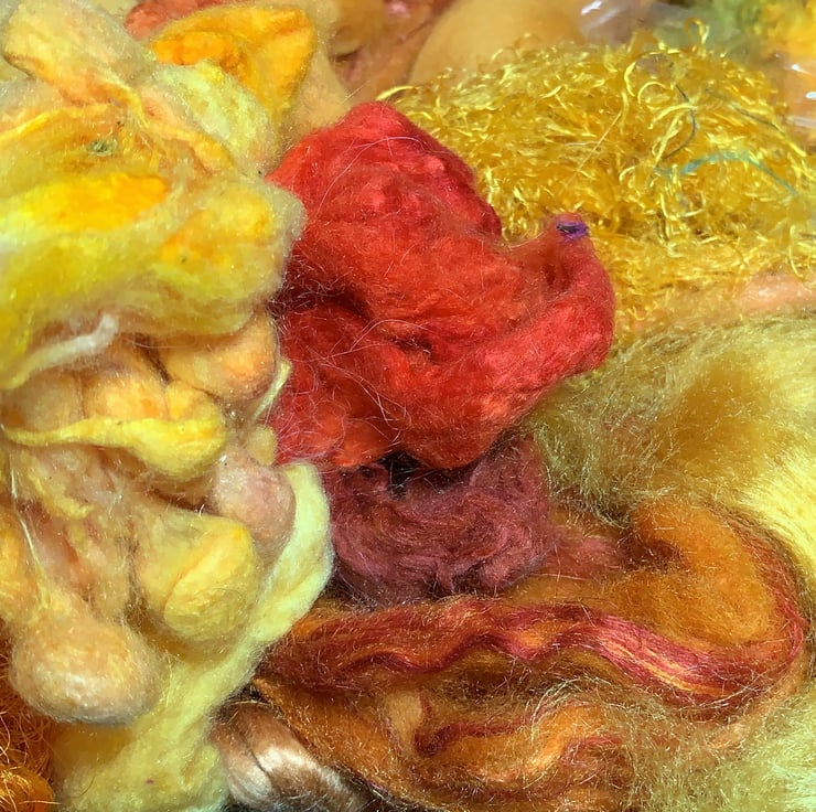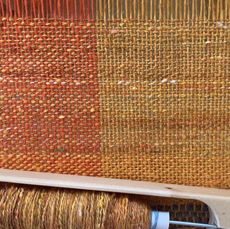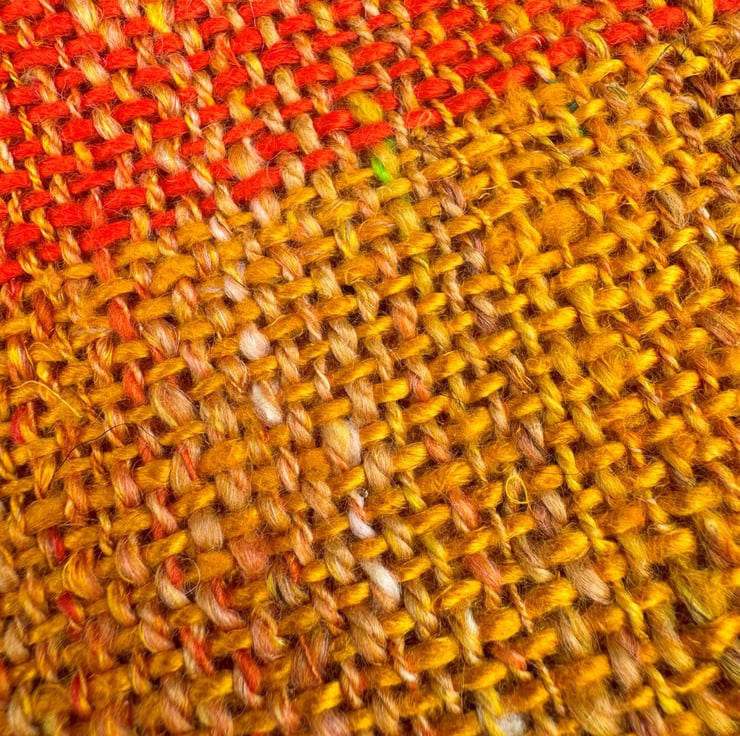Warm Italian sunshine is the inspiration for this scarf. I was designing a textile gift for a dear friend, based in Italy, who loves to wear accents of red, oranges and dark yellows. This made me consider how any scarf woven for warmer climes should be constructed from a light, open fabric, and woven that would be soft potentially for direct contact with skin. I hand-spun the weft from a variety of silks, baby camel and soft wool to give subtle variations in colour and texture.