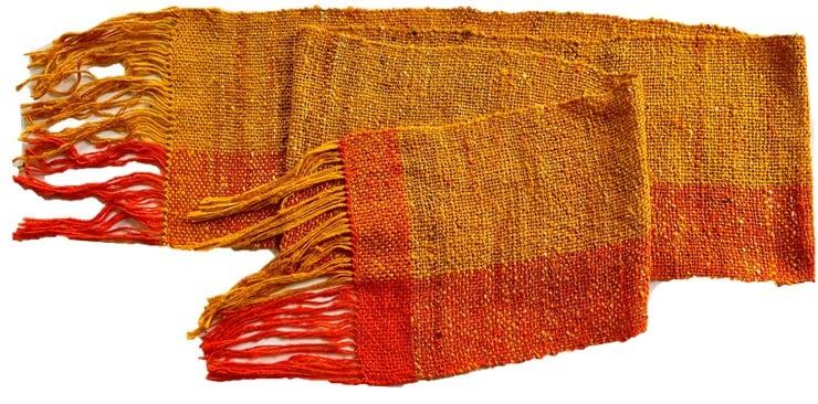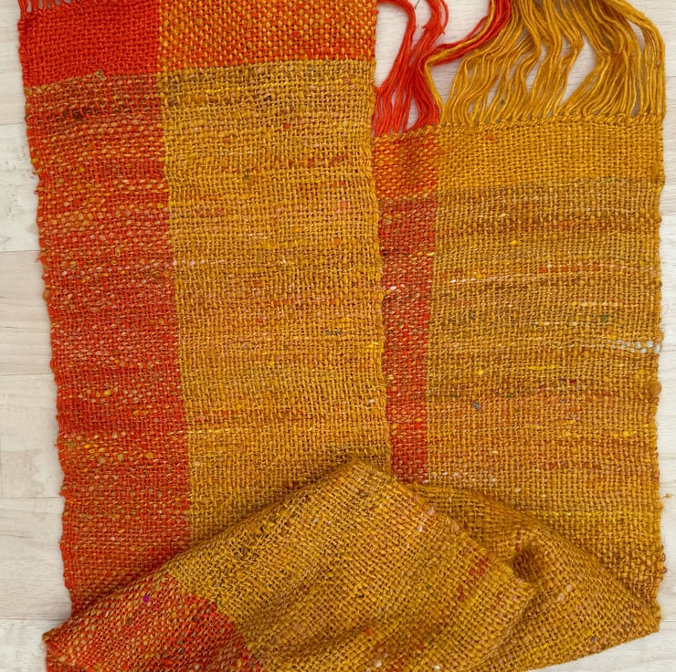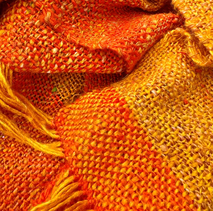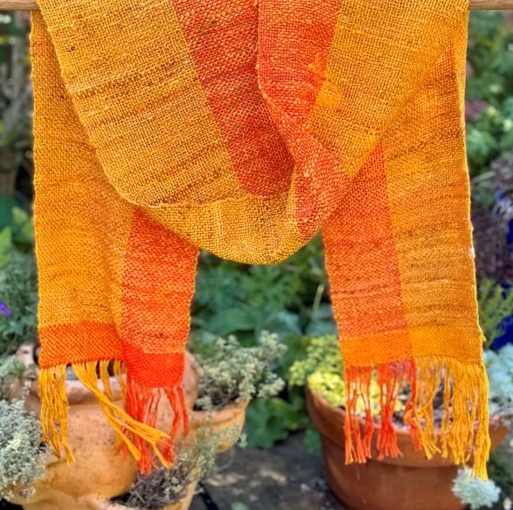 Ideal for wrapping round either summer shoulders or cold winter necks, this lightweight scarf, with its soft drape, features hand-spun and hand-woven materials. My hand-spun yarn mixes silk, baby camel and soft wool in a variety of deep golden yellows. I've woven it by hand in plain weave onto a warp of throwster's silk (mulberry silk recycled from the silk industry). Much of the width of the scarf echoes the deep gold colours of the hand-spun weft, with the remainder woven onto a bright orange warp. The scarf is just over 1.5m in length (excluding the tassels) and 18cm wide. Hand-wash carefully at low temperature and lie flat to air dry.